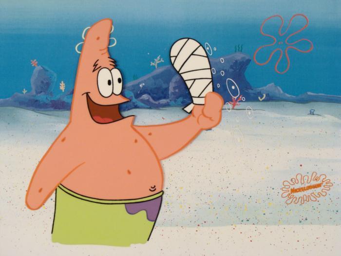 This animation cel and reproduction background are from the Nickelodeon TV show SpongeBob Squarepants. The story takes place under the deep blue sea in Bikini Bottom, where SpongeBob resides. SpongeBob, who is a yellow, porous sponge, is your typical happy-go-lucky character, as he is always cheerful and enjoys making people laugh. Patrick Star, SpongeBob's neighbor who is a starfish, is your average children's show idiot, as he boasts knowing nothing and is often getting himself into ridiculous situations. Between the homes of these two lies the home of the miserable Squidward, a squid, who is known for being grouchy and playing tricks on SpongeBob and Patrick. Both SpongeBob and Squidward work at the Krusty Krab, a fast food business run by the greedy money-loving Mr. Krabs, a crab, the arch rival of the evil, possibly misunderstood, Plankton. Another neighbor, Sandy Cheeks, an athletic squirrel who normally wears an astronaut's space suit, was introduced in "Tea at the Treedome." She spends most of her time inventing and experimenting. Patrick broke his thumb.Original Printed Background and Animated Cel Overall Size of Background: 10 1/2" x 17" Overall Size of the Cel: 10 1/2" x 12 1/2" Very good condition This is an original hand-painted cel set-up used in the production of an episode of "SpongeBob SquarePants." Each one-of-a-kind set-up represents a slight change in position of the characters. When individually photographed and projected in rapid succession, the images appear to move.
