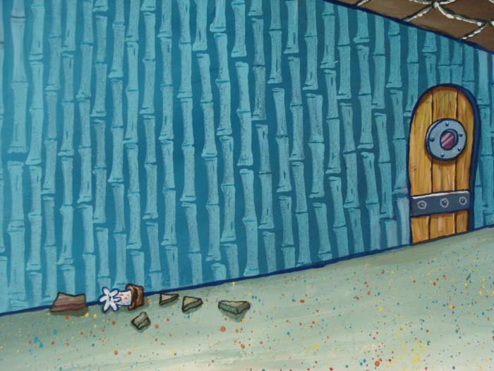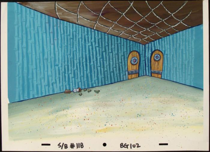 This original hand-painted background from the Nickelodeon TV show SpongeBob Squarepants. The story takes place under the deep blue sea in Bikini Bottom, where SpongeBob resides. SpongeBob, who is a yellow, porous sponge, is your typical happy-go-lucky character, as he is always cheerful and enjoys making people laugh. Patrick Star, SpongeBob's neighbor who is a starfish, is your average children's show idiot, as he boasts knowing nothing and is often getting himself into ridiculous situations. Between the homes of these two lies the home of the miserable Squidward, a squid, who is known for being grouchy and playing tricks on SpongeBob and Patrick. Both SpongeBob and Squidward work at the Krusty Krab, a fast food business run by the greedy money-loving Mr. Krabs, a crab, the arch rival of the evil, possibly misunderstood, Plankton. Another neighbor, Sandy Cheeks, an athletic squirrel who normally wears an astronaut's space suit, was introduced in "Tea at the Treedome." She spends most of her time inventing and experimenting. Who broke the flower pot?Original Production Background Overall Size of Background: 10" x 14" Very good conditionOriginal Production Backgrounds are used in the making of the final version of animated productions. The background establishes the location and the overall good mood of the scenee. Typically, a background layout artist creates a drawing to establish the content of the scene, placement of characters, perspective and camera angle. Based on this drawing, the background artist creates a preliminary painting to confirm all of the scenes details, then the final production background which is used in the filming of the scene. When these backgrounds are individually photographed behind the progression of production cels, and projected at a rapid succession, the images in the foreground appear to move, creating an animated scene. The background is ready to be matted and framed. It is a colored background with the animator's notations at the bottom.