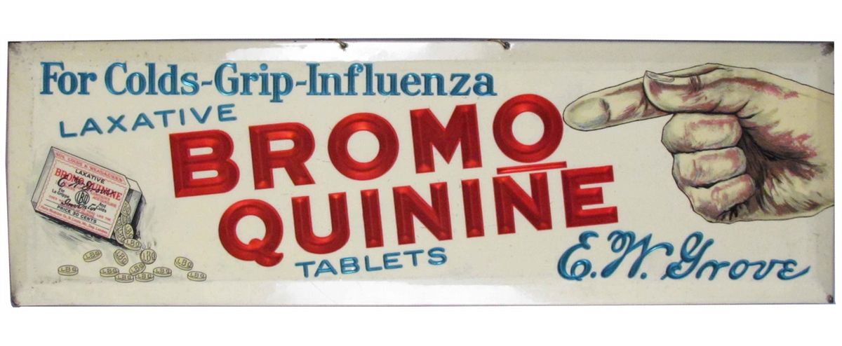 Bromo Quinine Laxative Celluloid Chain Hanging Sign. Excellent original condition. 18 X 5 3/4 inches.