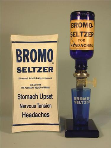 Bromo Seltzer Dispenser including glass and glass tray. Excellent condition.