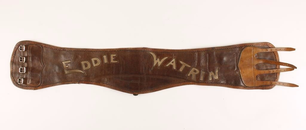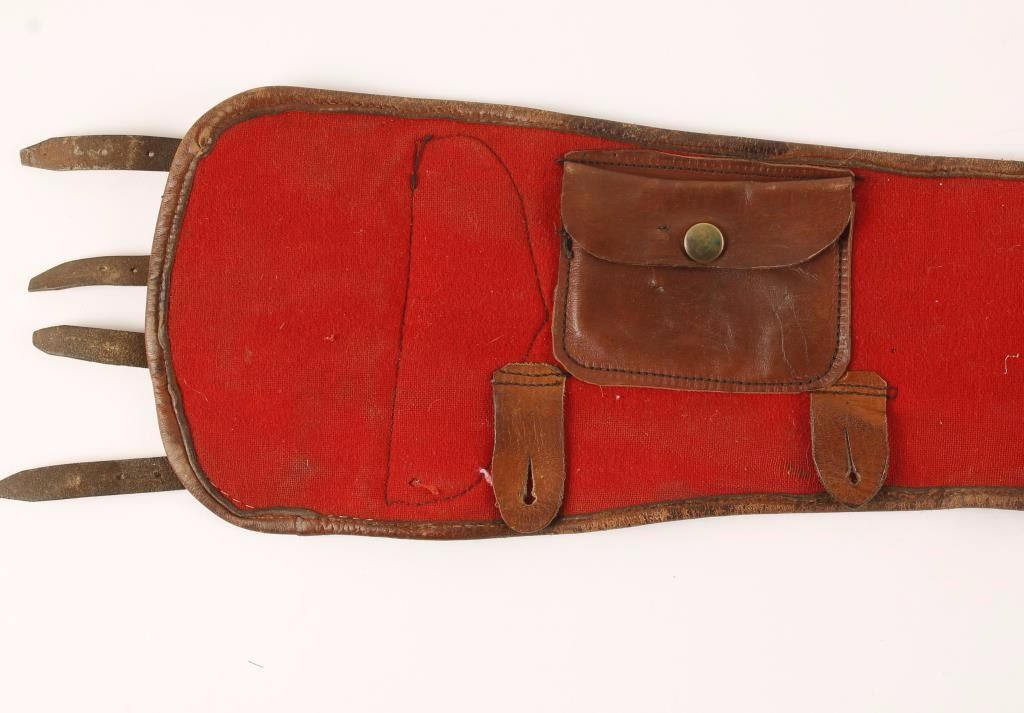 Smooth brown two toned leather with the name 'Eddie Watrin'. Red flannel lined with interior leather pouch. Circa 1930s in very good condition.