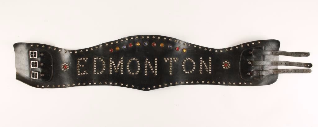 Given as the Edmonton Canada Rodeo award. Smooth black leather with silver studded and jeweled design. In very good condition.