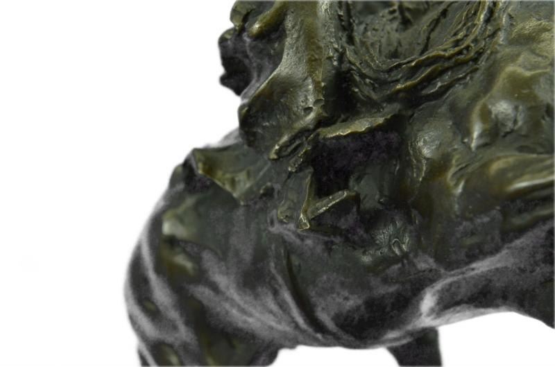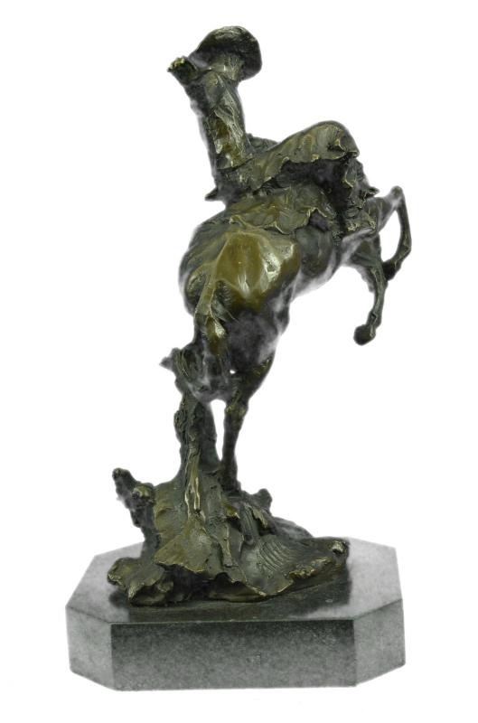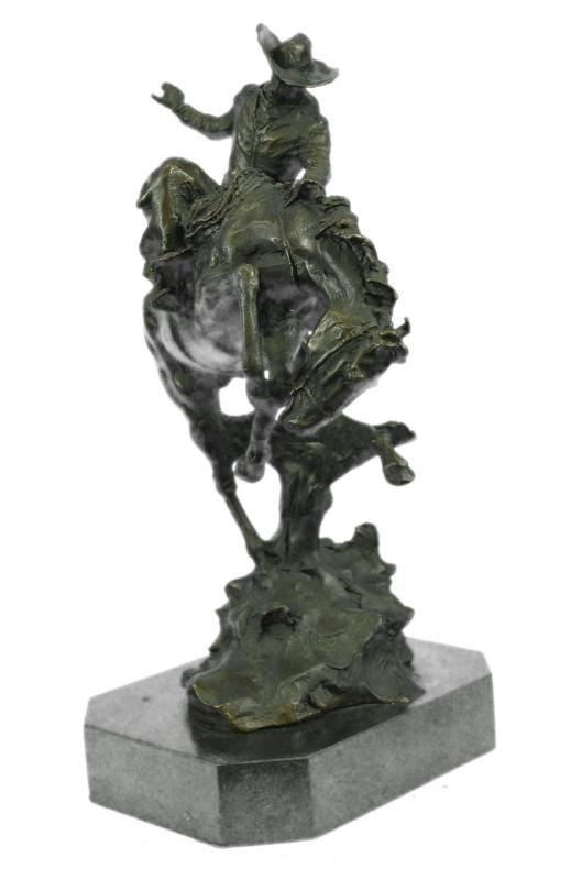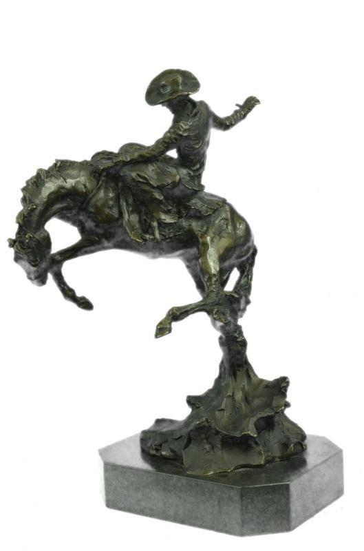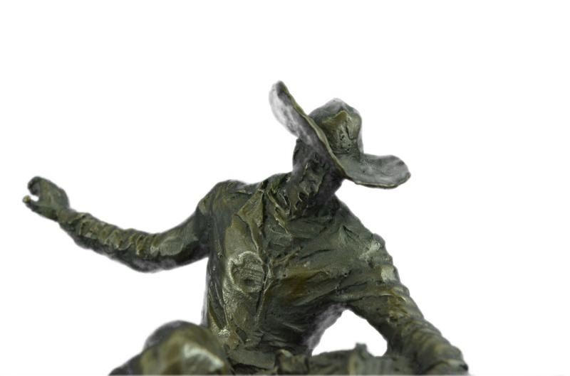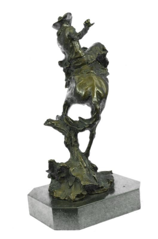 A seasoned trooper cowboy is casually patrolling the area. He and his loyal horse gallop through the open dry plains. He is dressed in a shirt, chaps, and boots, giving him the look of a good ole fashioned sheriff. A long rifle is slung to his side. This two-toned brown patina sculpture was cast using the Lost Wax Method and mounted on a marble base. Dimensions: Height 15 X Width 10 inches. Weight: 17 LBS.