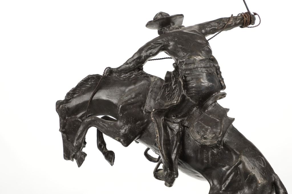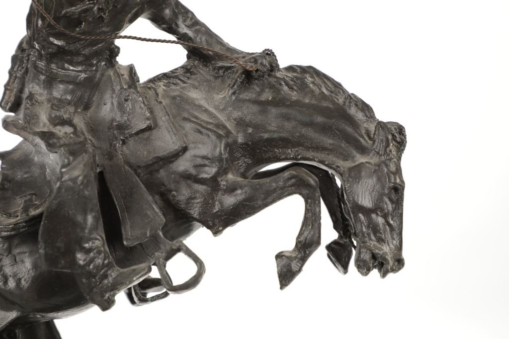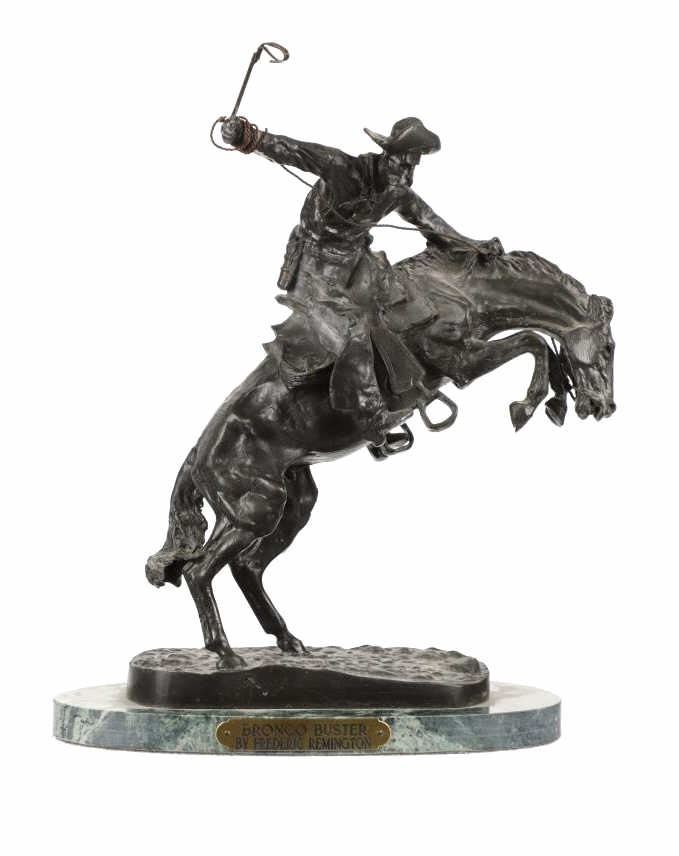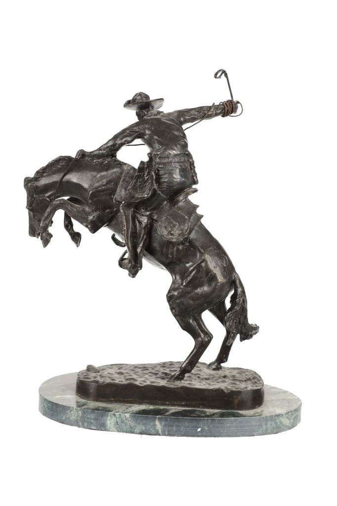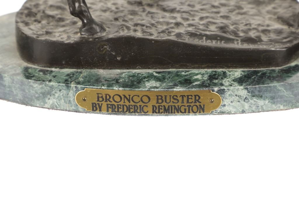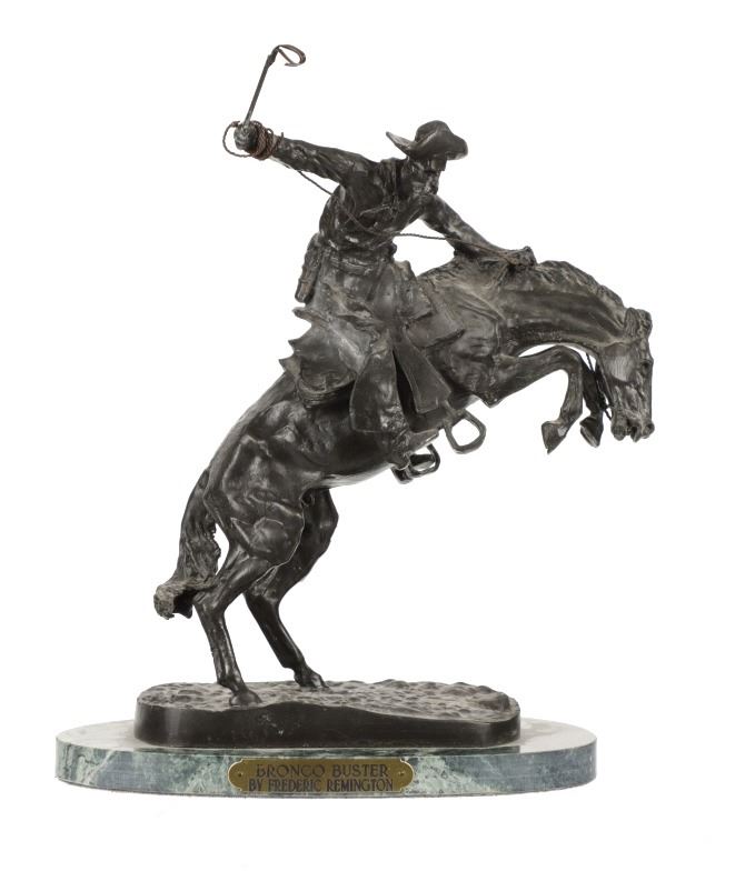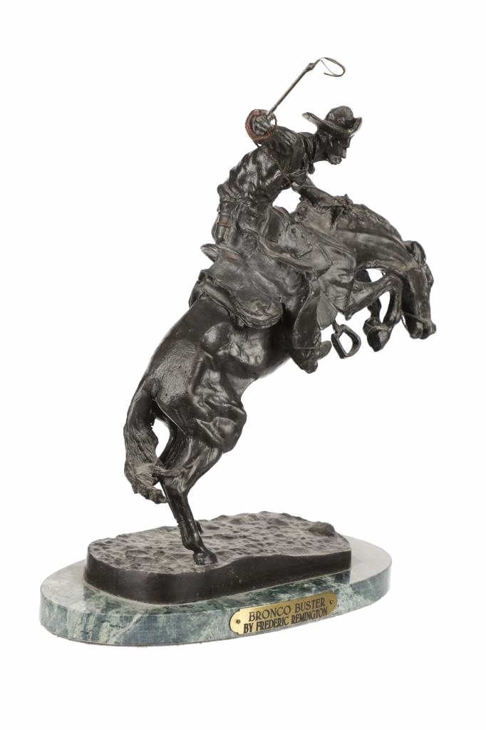 Featured in this lot we have a casting of "Bronco Buster" by American artist Frederic Remington. The Bronco Buster, originally created in 1895, was Frederic Remington's first bronze sculpture and has become a symbol of the heroic ideal of the American west. There has been a bronze cast of 'The Bronco Buster' in the White House since the days of Theodore Roosevelt. The statue depicts a cowboy in the middle of wrangling a bucking bronco which is in mid leap. The sculpture shows a hand carved engraving at the base reading "Frederic Remington". The statue is set onto a green marble base. The condition of this bronze sculptor is good with no obvious signs of damage and shows good overall condition. The measurements of this bronze sculpture is 14 1/4" x 6" x 10 1/2".