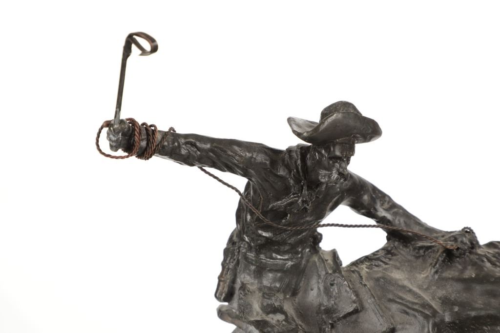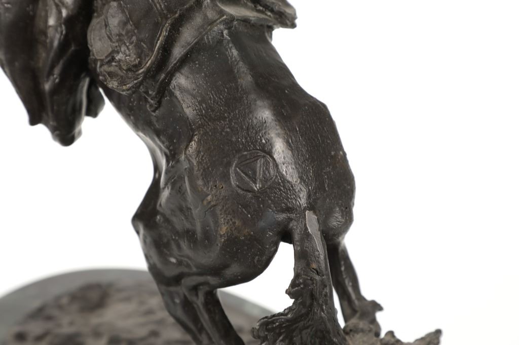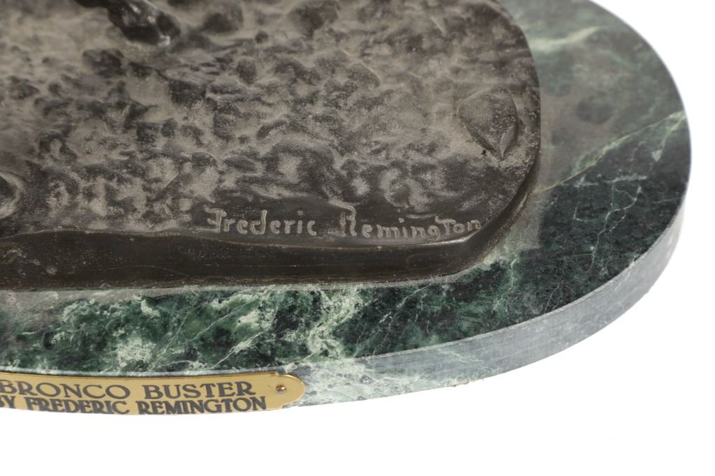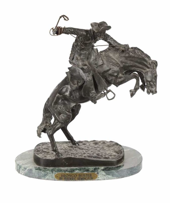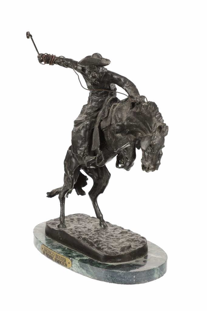 Featured in this lot is a casting of "Bronco Buster" by American artist, Frederic Remington. The Bronco Buster, originally created in 1895, was Frederic Remington's first bronze sculpture and has become a symbol of the heroic ideal of the American west. There has been a bronze cast of 'The Bronco Buster' in the White House since the days of Theodore Roosevelt. The statue depicts a cowboy in the middle of wrangling a bucking bronco which is in mid-leap. The sculpture shows a hand carved engraving at the base reading "Frederic Remington". The statue is set on a green marble base. The overall condition of this bronze sculptor is good with no obvious signs of damage. This is exact piece previously sold for nearly $1,400 in early 2023. The measurements of this after bronze sculpture are 14 1/4" x 6" x 10 1/2".*