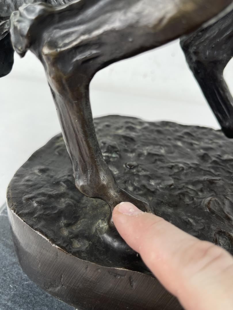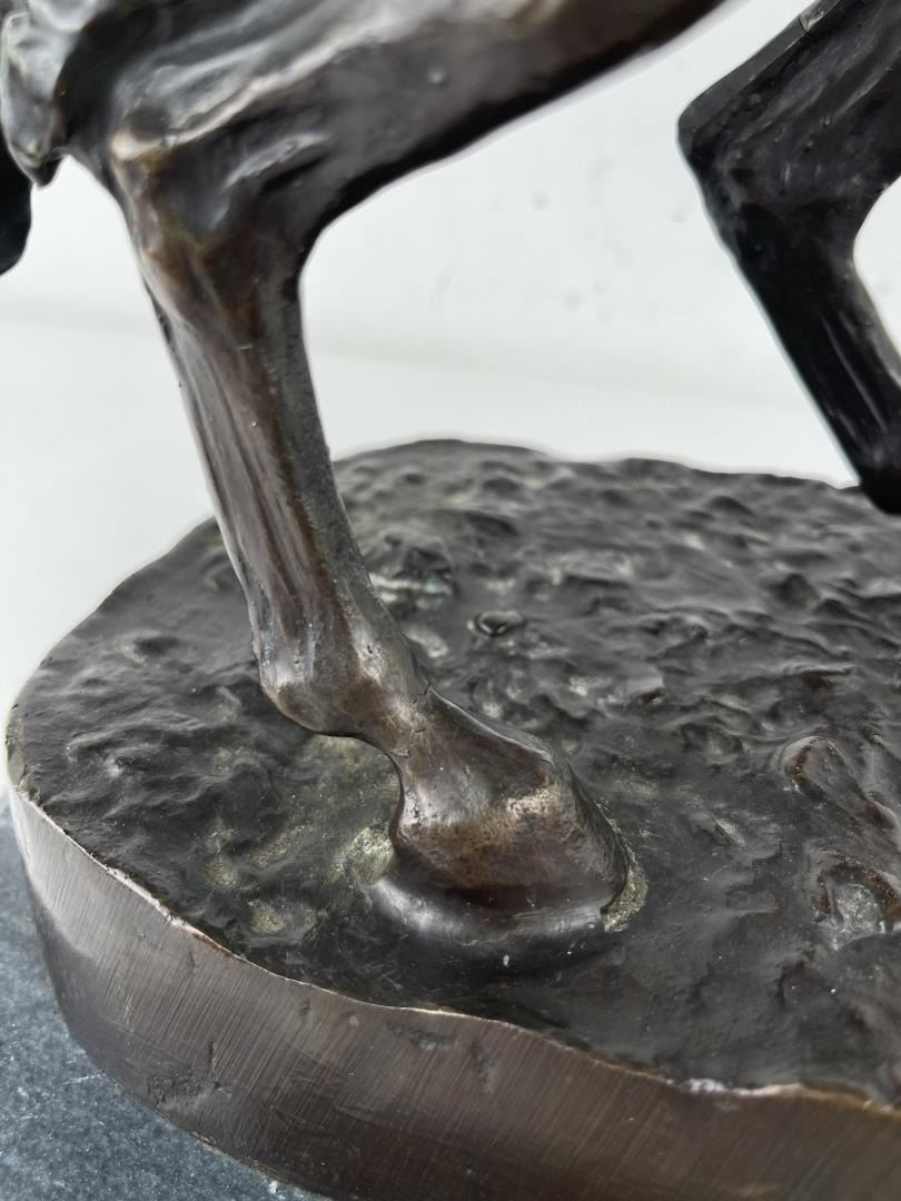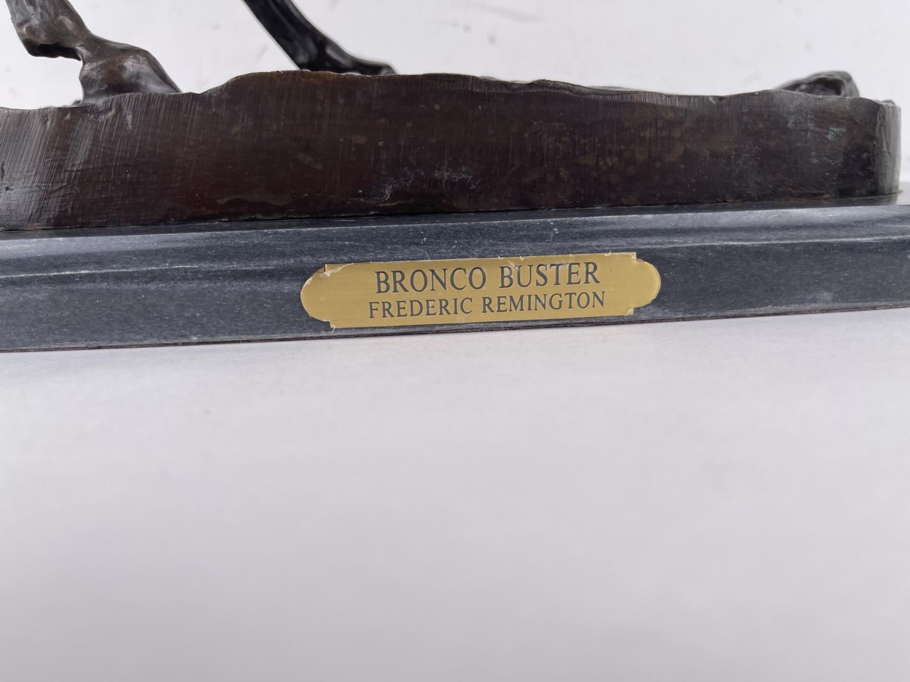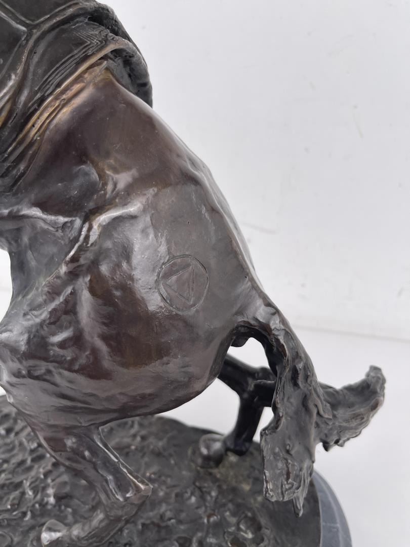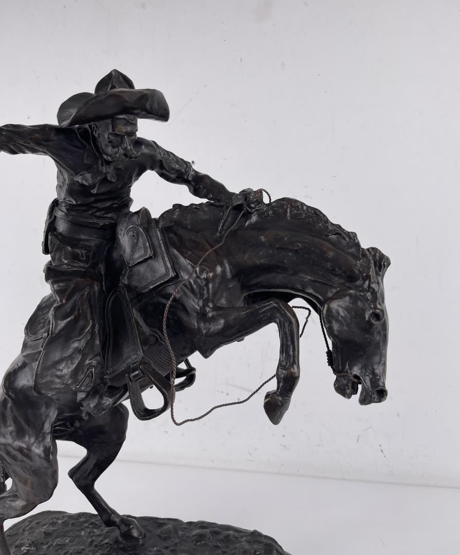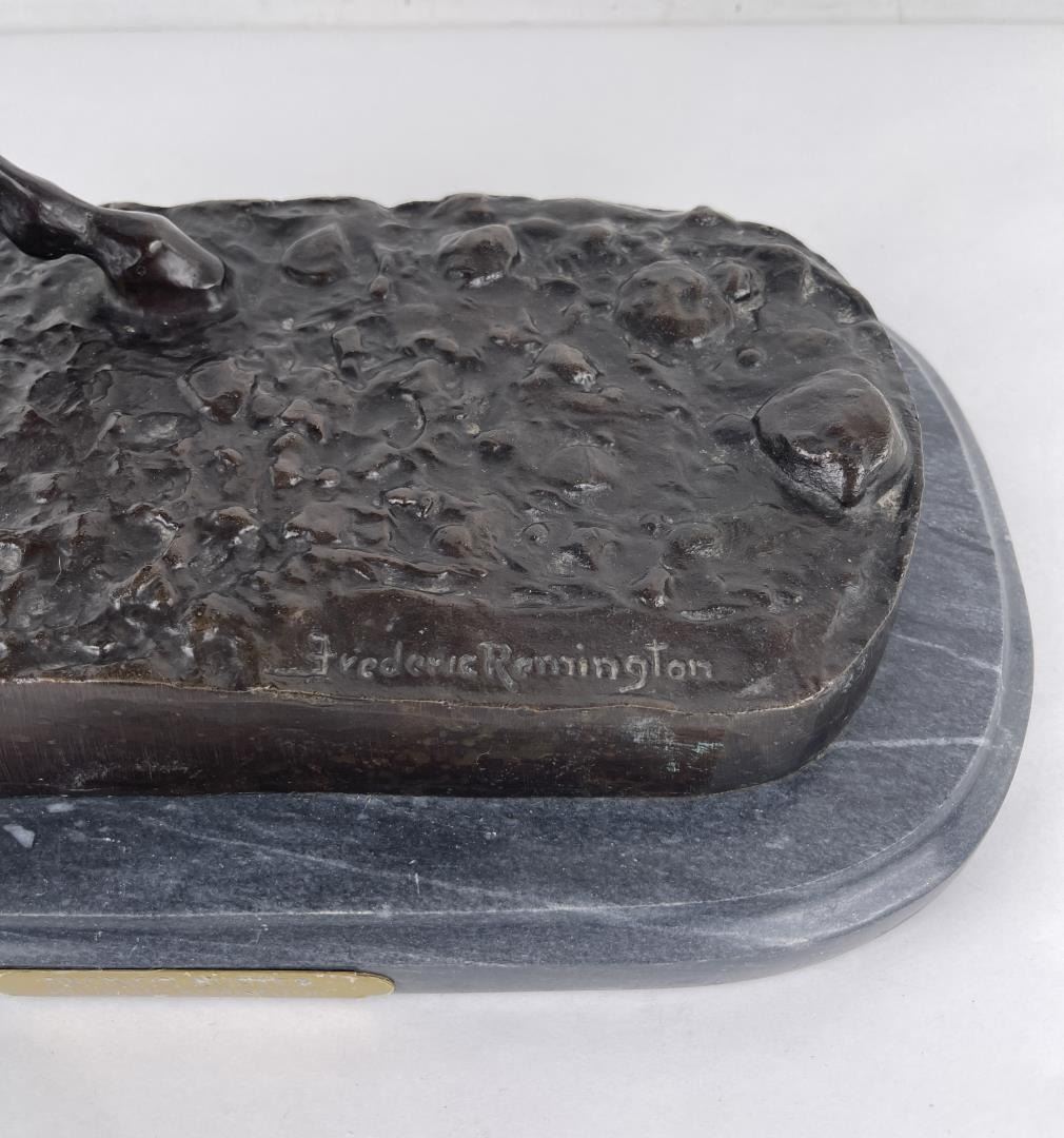 22 7/8" tall, 18 7/8" long. In his lifetime polymath Frederic Remington was the most successful and famous Western American artist. His immense talents included excelling as an illustrator, author, sculptor, and fine artist. His was a life tragically cut short. Born on October 4, 1861 in Canton, a small berg in bucolic upper state New York, he was much influenced by his father Seth Pierpont Remington, a Republican journalist who founded the St. Lawrence Plaindealer. His father had been a captain in the Civil War, and in 1870 President Ulysses S. Grant appointed him United States Collector of the Port of Ogdensburg, New York. In 1876 young Frederic enrolled at Highland Military Academy in Worcester, Massachusetts where he studied for the next two years. Two years later he enrolled at Yale for one year to study in the School of Fine Arts. His two loves were art and football. Only three months into school, he published his first illustration in the on-campus newspaper Yale Courant. On the gridiron he was a natural, demonstrating great strength and agility. Like Theodore Roosevelt, Remington also enjoyed boxing. A year later he met his future wife Eva Caten from Gloversville, New York. After the death of Remington’s father from tuberculosis on February 18, 1879, Eva rejected his first marriage proposal. Floundering, Remington headed to the American West to find himself—much like Theodore Roosevelt did when his mother and wife died on the same day. That led to a trip to Montana where he completed a number of sketches. Invigorated by his Western experiences, in February 1883 he headed to Kansas and with part of his inheritance bought a 160 acre sheep ranch near Peabody, Kansas. That failed adventure lasted about a year, and he then relocated to Kansas City, Missouri where Eva would join him as his wife. Yet he squandered the rest of his inheritance on a saloon there. After more illustrations were sold to Harper’s Weekly, in 1885 the Remingtons moved to New York City, and in 1886 he attended the Art Students League. By then Remington was earning $1,200 a year, twice the income of a school teacher. Other magazines such as St. Nicholas and Outing also published his art. His work certainly impressed a young Theodore Roosevelt who was chronicling his life in Medora—now in North Dakota—for a serial that ran in The Century Magazine. It was very common at the time for authors to serialize their works in magazines before they were published in book form. In the fall of 1887 Remington was commissioned to illustrate the magazine stories which ended up in Roosevelt’s 1888 classic book Ranch Life and the Hunting Trail. Early on, a lasting friendship between the two was cemented through these publications. By 1889 he had garnered national notoriety as one of the most accomplished illustrators in the country. He was a national celebrity. In 1889 his monumental canvas A Dash for the Timber was exhibited at the National Academy of Design. The New York Times reported, "The picture at the Autumn exhibition of the Academy of Design before which stands the largest number of people is Frederic Remington’s Dash for the Timber." A Silver medal for Last Lull in the Fight followed at the Exposition Universelle in Paris. In 1891 the National Academy of Design elected Remington as an Associate member. Yet he was never admitted as National Academician, despite support from fellow artists Gilbert Gaul, Childe Hassam, and others. His financial success allowed the Remingtons to move into a grand home he named Ednion Algonquin for "a place where I live in New Rochelle, New York. A young Norman Rockwell would someday paint in his studio. Through his travels, Remington embraced social Darwinism survival of the fittest that championed the U.S. military’s domination of the inferior Native Americans. Theodore Roosevelt, George Armstrong Custer, and Remington along with most other Americans—idolized Charles Darwin. As early as 1888 Remington started contributing short stories along with illustrations to magazines. His writings teemed with romantic Western stories chalk full of drama and violence. Initially, they presented the cavalryman as the hero and the Indian as the villain, especially when the Indian had been tainted with the vices of the white man. His West was the "frontier model where the fittest were rugged individuals from northern Europe and white Americans. Even though he was an accomplished author and painter, perhaps his greatest talent was as a sculptor. His bronzes are more famous and collectible than any other Western American artist. And yet his bronze repertoire was completed in just fourteen years. Starting in order of modeling, they are: The Broncho Buster, The Wounded Bunkie, The Wicked Pony, The Scalp, The Norther, The Cheyenne, The Buffalo Signal, Coming Through the Rye, The Mountain Man, The Sergeant, Paleolithic Man, Savage, Polo, The Rattlesnake, Dragoons 1850, The Outlaw, The Horse Thief, The Buffalo Horse, The Cowboy, Trooper of the Plains 1868, The Broncho Buster (large), and The Stampede. His Coming Through the Rye was widely viewed by the public at two world’s fairs. A New Jersey artisan in 1904 was commissioned by Remington to produce a heroic size plaster of the sculpture for the 1904 Louisiana Purchase Exposition in St. Louis, Missouri (called Off the Trail). It was then shipped to Portland, Oregon the next year for the Lewis and Clark Exposition and titled Shooting Up the Town. The Cowboy—his only monumental bronze—was commissioned in 1905 by the Fairmount Park Art Association in Philadelphia. The twelve feet high bronze was shipped to Philadelphia in May 1908 and unveiled in the park as The Mounted Cowboy. In 1900 Remington turned to Riccardo Bertelli at Roman Bronze Works in Brooklyn to cast his bronzes by the lost-wax casting process which allowed higher detail in the finished product. The Norther that year was his first bronze by this method. The Cheyenne was copyright
