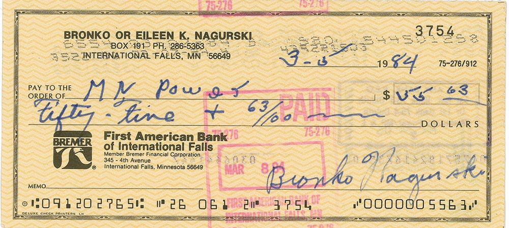Personal check, 6 x 2.75, filled out and signed by Nagurski, payable to MN Power for $55.63, March 5, 1984. In fine condition, with standard bank stamps over his signature.