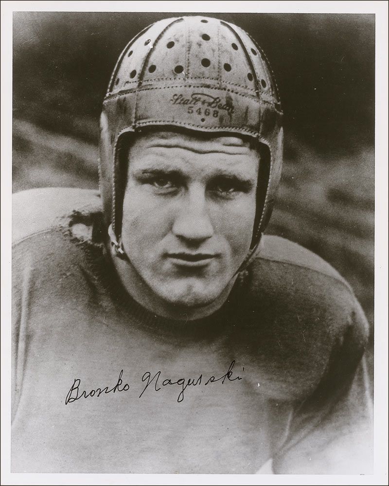 Glossy 8 x 10 photo of Nagurski in his football pads and leather helmet, signed in black felt tip. In fine condition.
