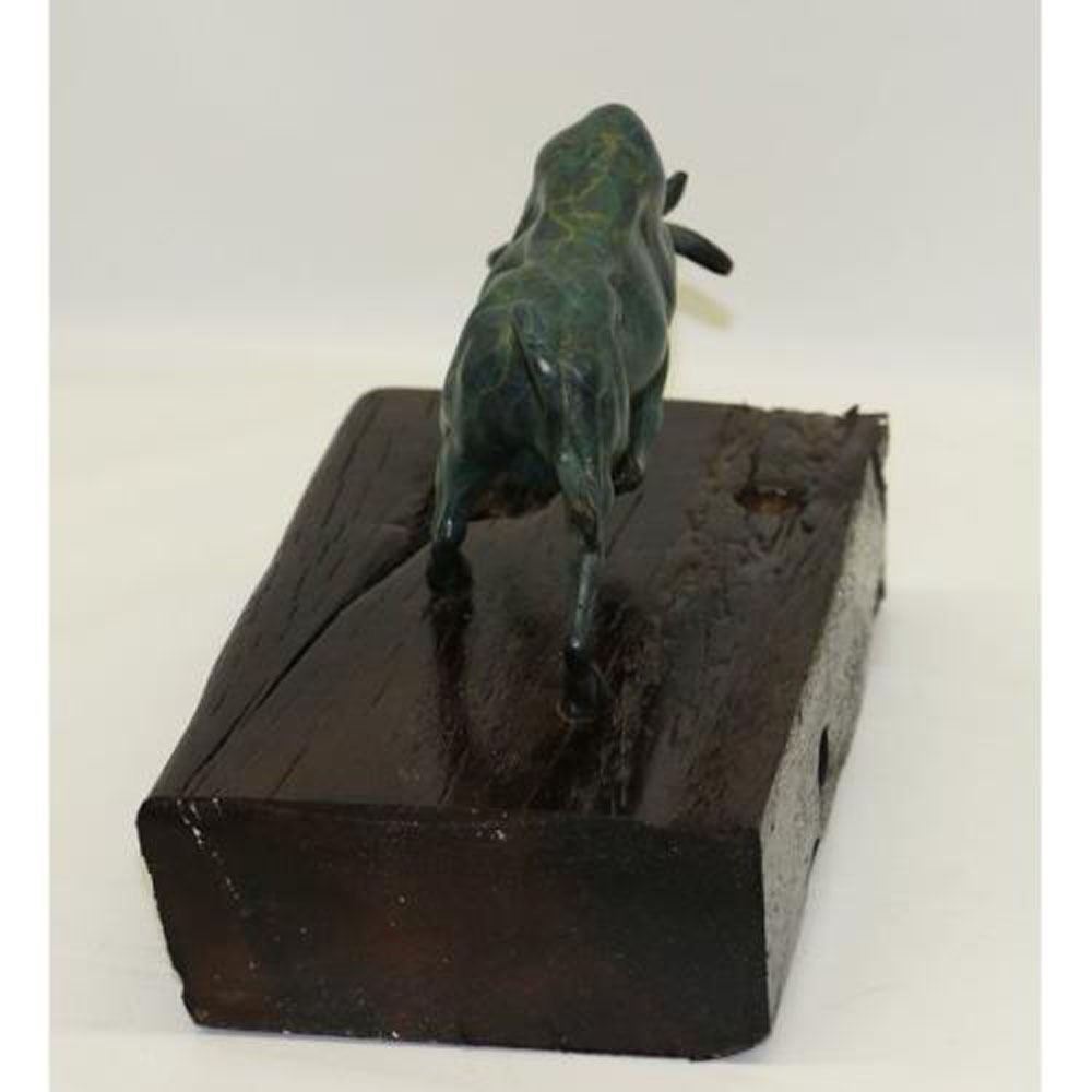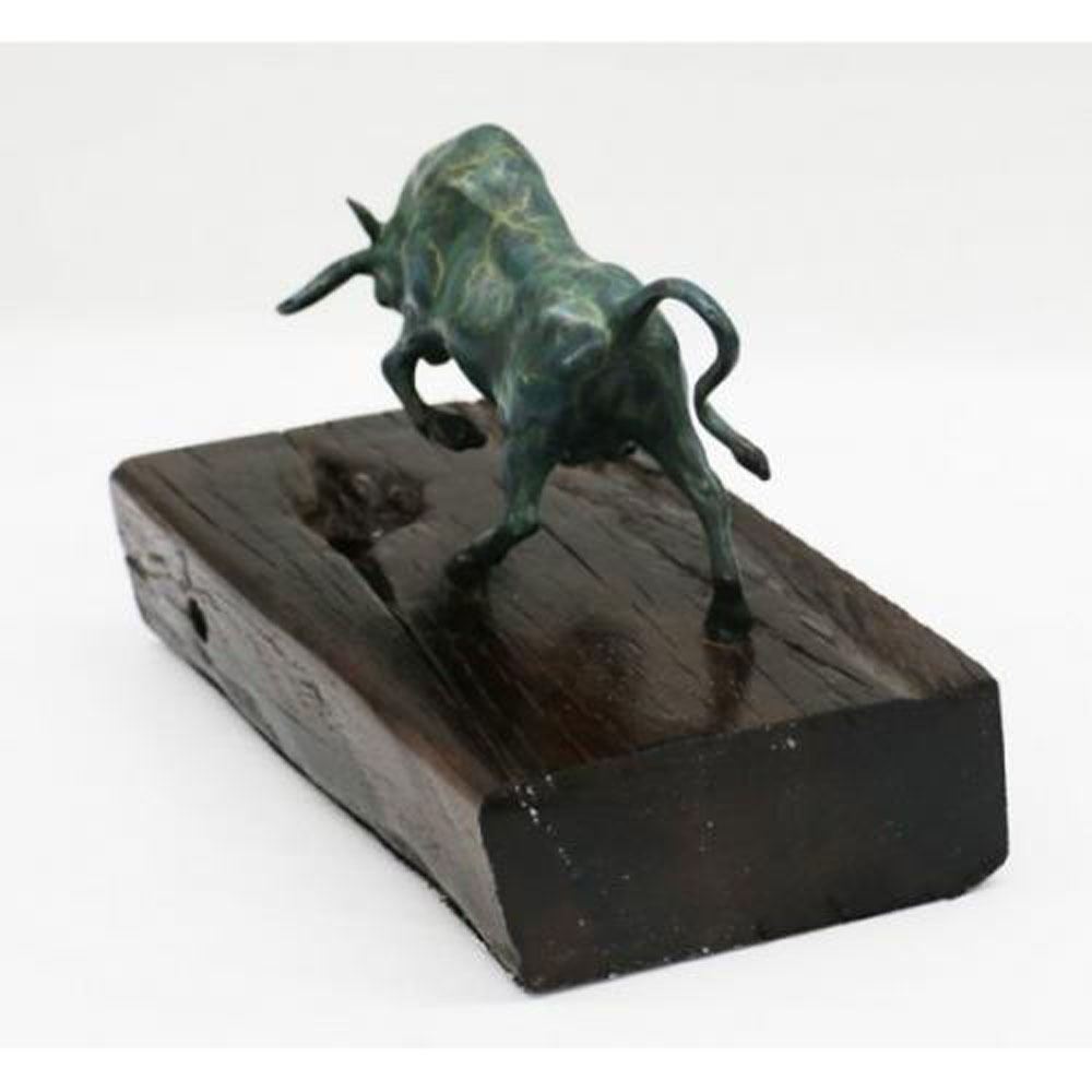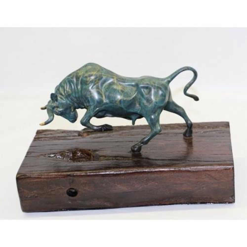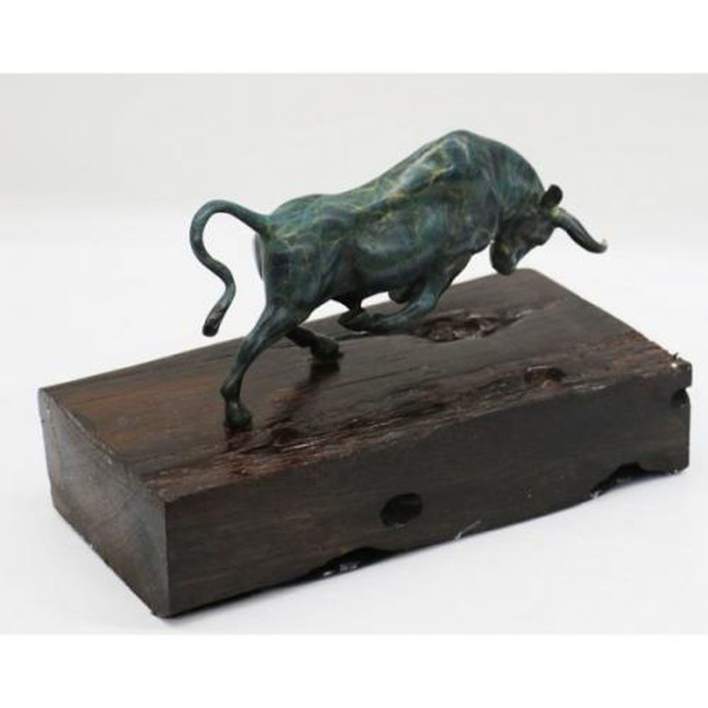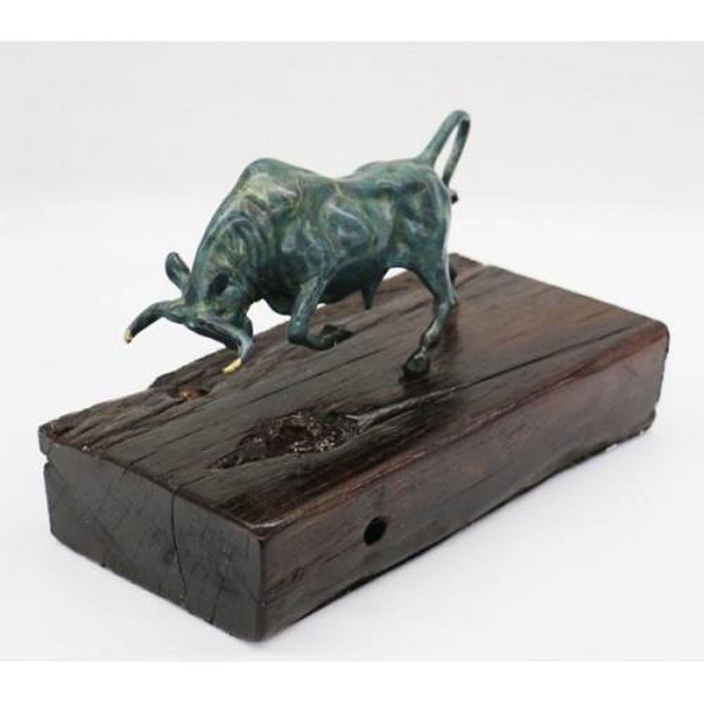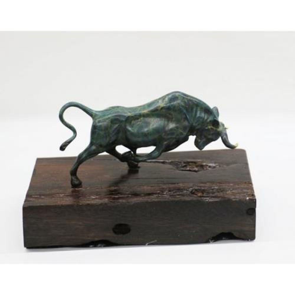 Bulls are much more muscular than cows, with thicker bones, larger feet, a very muscular neck, and a large, bony head with protective ridges over the eyes. These features assist bulls in fighting for domination over a herd, giving the winner superior access to cows for reproduction. The hair is generally shorter on the body, but on the neck and head, there is often a mane of curlier, woolly hair. Bulls are usually about the same height as cows or a little taller, but because of the additional muscle and bone they often weigh far more. This bull is leaning his head a little down and he is eating greens off the floor. This sculpture was cast using the ancient old Lost Wax Method stained in brown patina finish for preservation. Bronze Dimensions: Height 7 X Width 10 Inches. Weight: 5 LBS.