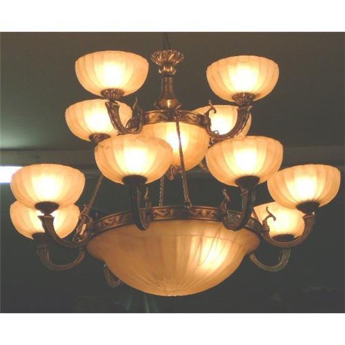 <tr><td>Title:Bronze & Alabaster Colored Glass Chandelier</td></tr>