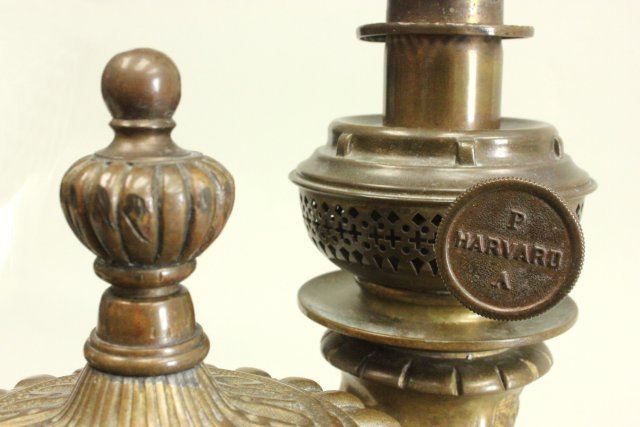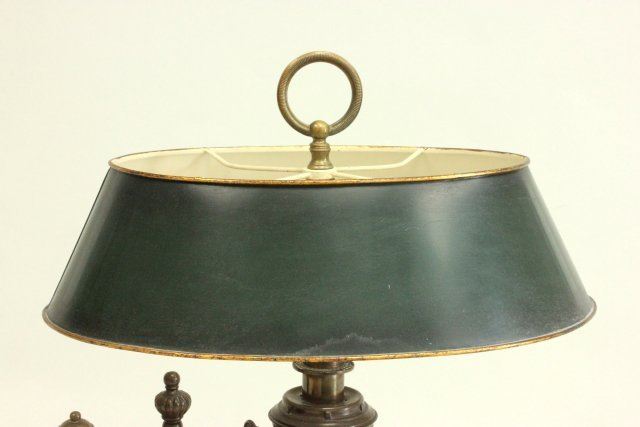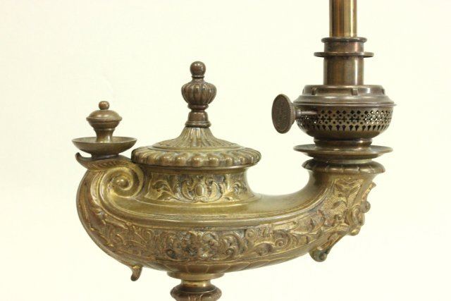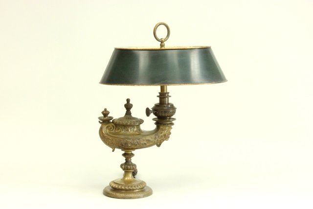 Originally oil converted to electric with tole lamp shade. Approx. 19" H to finial. Good condition.
