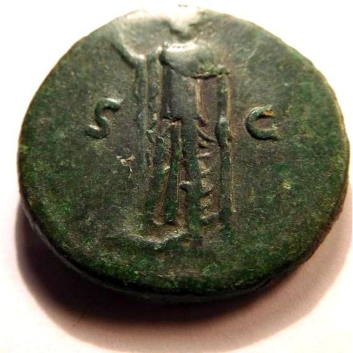Obverse: IMP CAESAR VESP AVG COS VII ("Emperor and Caesar, Vespasian, Augustus, consul year 7"); laureate head right. Reverse: Spes standing left, holding flower and raising hem of skirt. Reference RIC 894 Size: 22 mm. $150.00 reserve NOTE THE BEAUTIFUL GREEN PATINA JC-30101-15