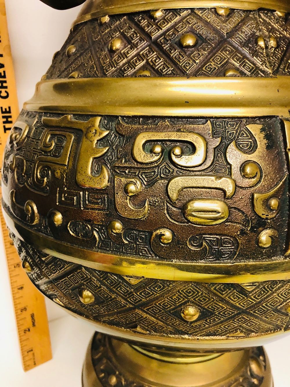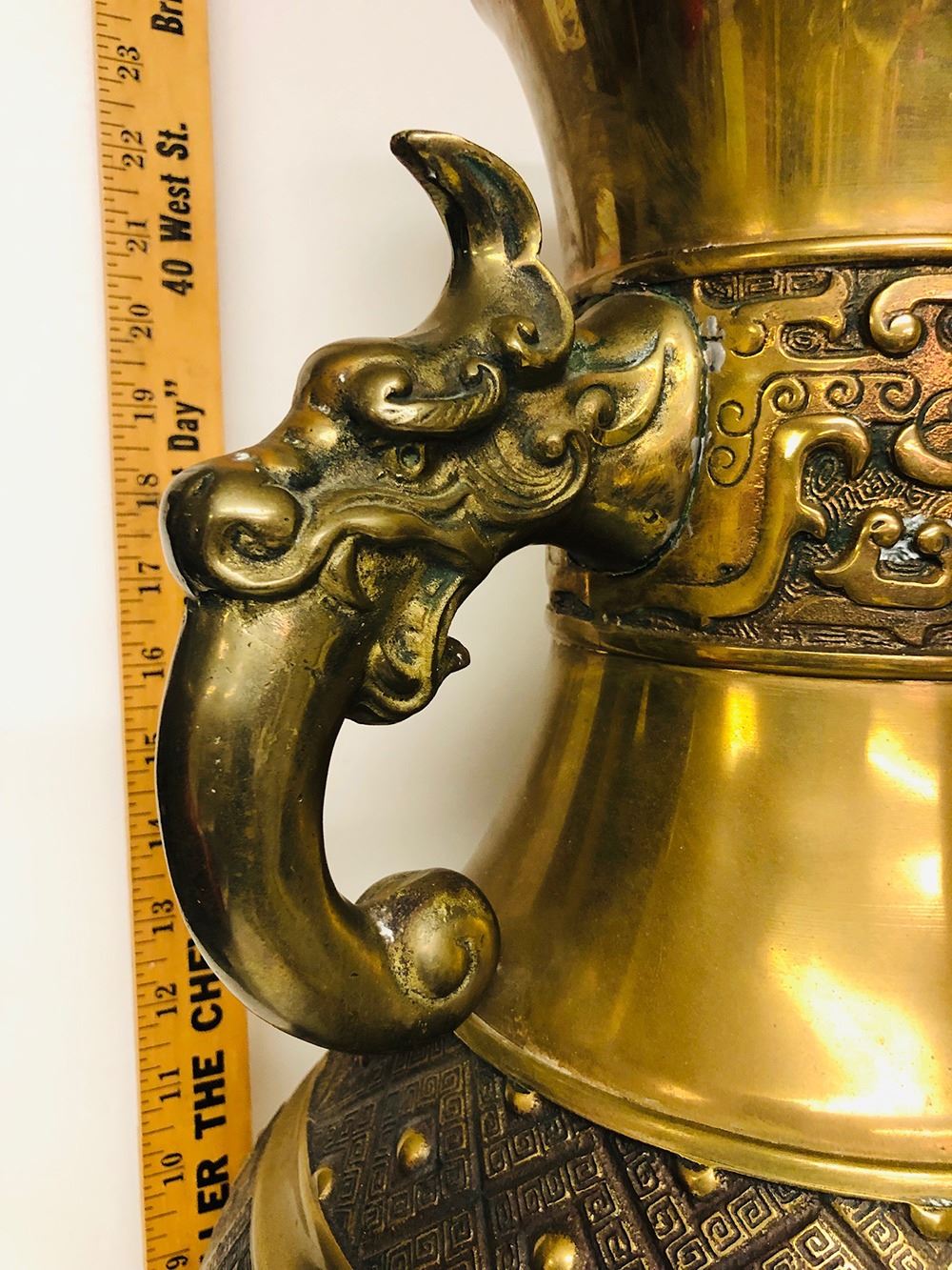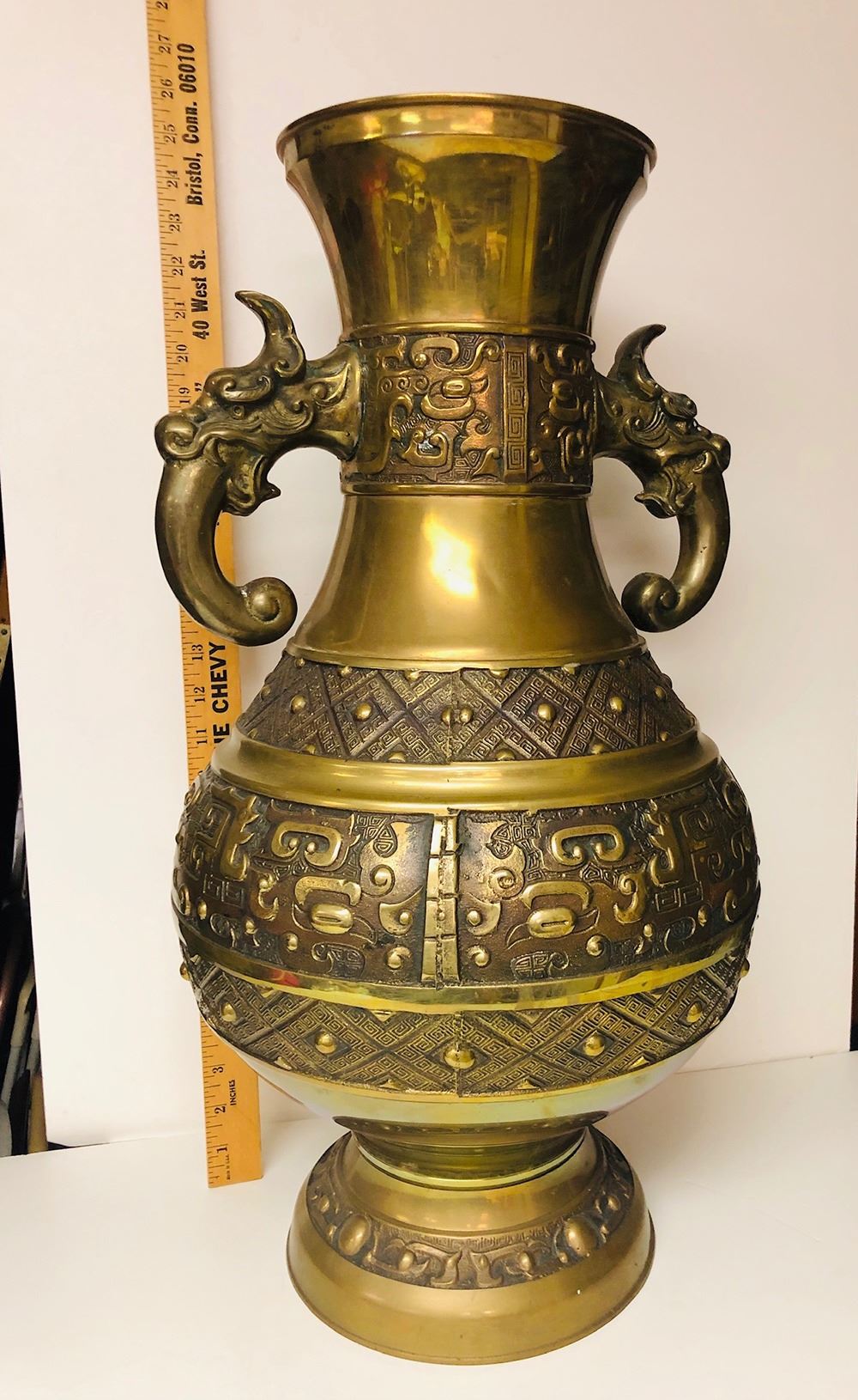 Large bronze Asian vase, double handles with dragon heads, measures approx. 25” tall.