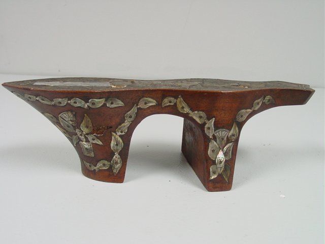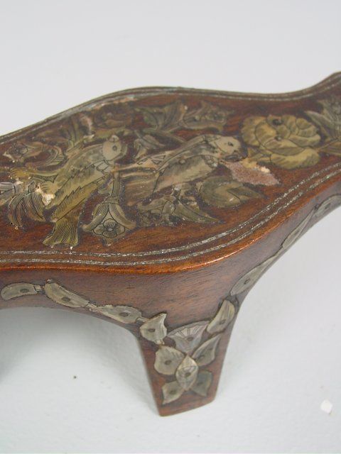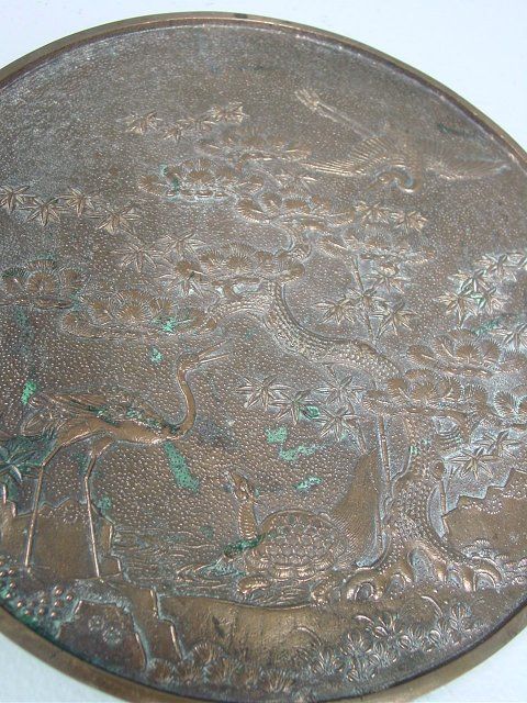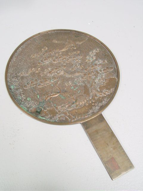 1- Bronze Asian mirror with scene depicting "Cranes & Pon Tree", approx. 12" x 8" W. 1- Mother of pearl inlaid Chinese pillow depicting "Birds", approx. 10.25" W x 3". Please read our terms of sale.