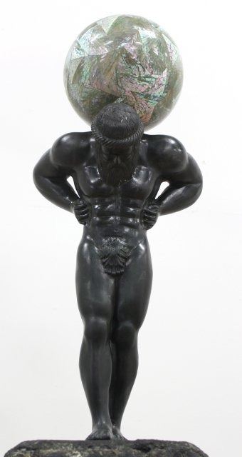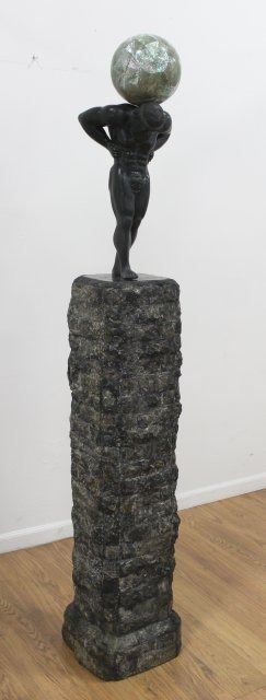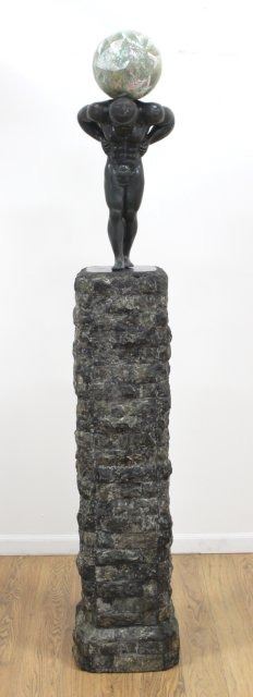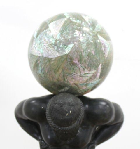 Mother of pearl veneer ball. On rockwork pedestal. Figure with ball approx. 26" H. Total approx. 74" H. Originally from a South Hampton Estate.