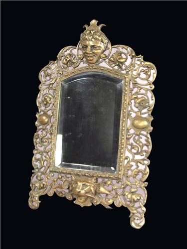 Bronze Beveled Mirror, boy and lion head motif with easel back. Excellent condition. 14 X 22 inches.
