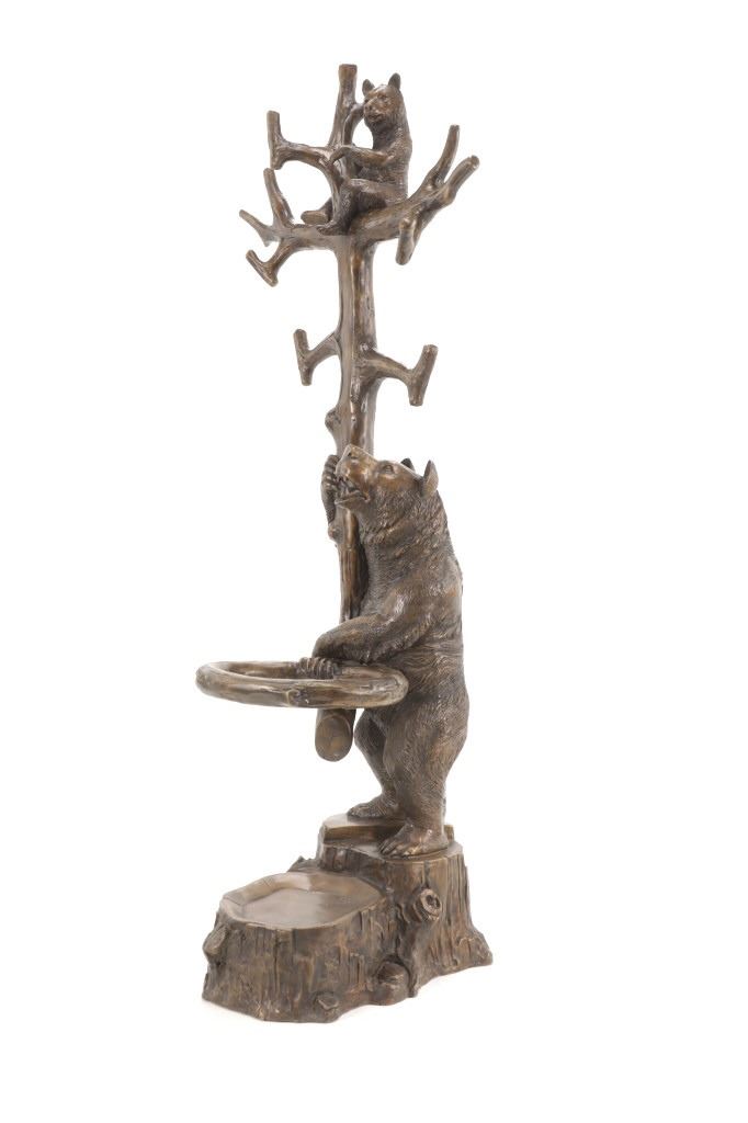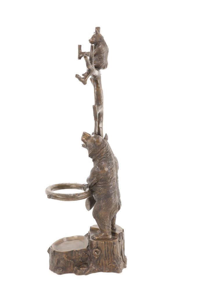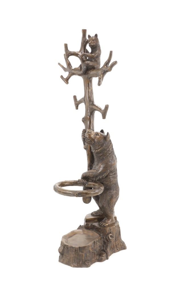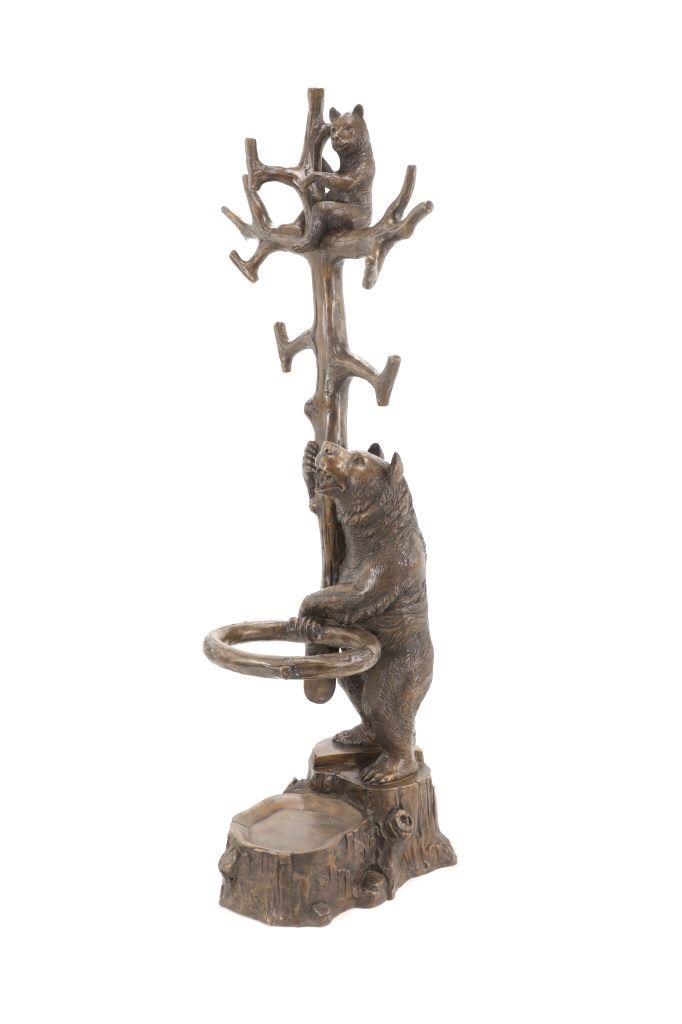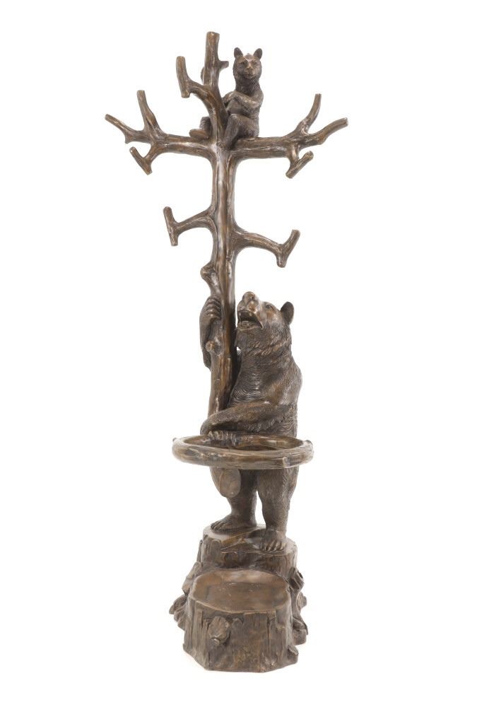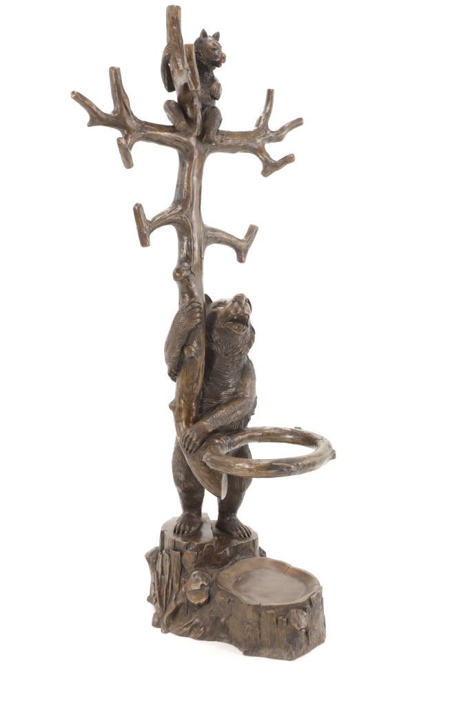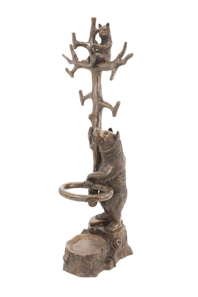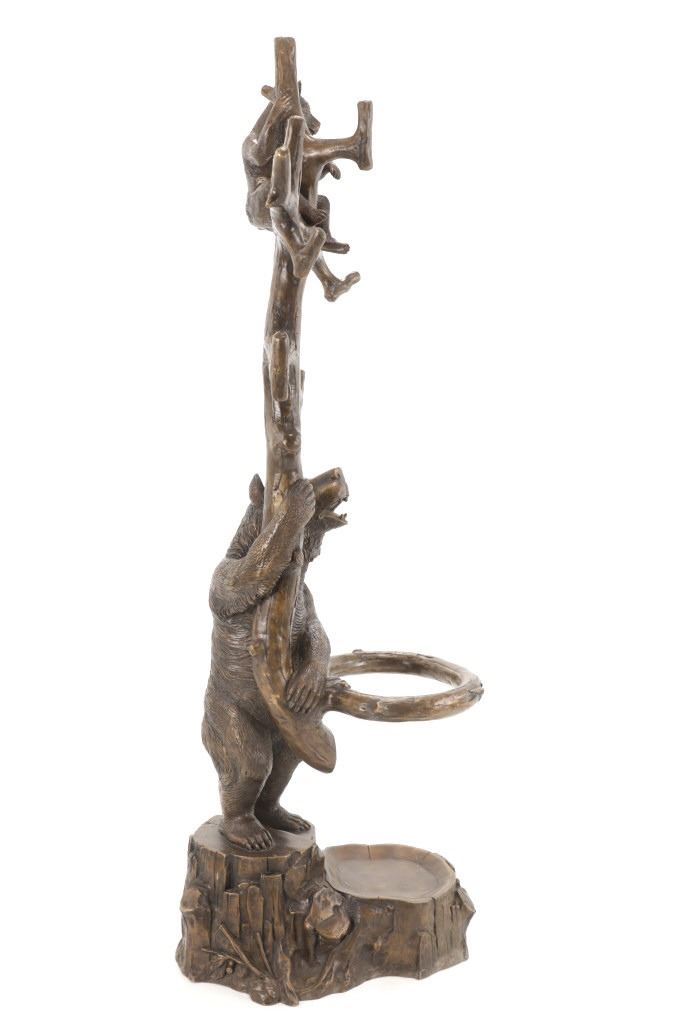 This is an outstanding, large Black Forest bronze hall tree umbrella stand sculpture showing a classic German Black Forest pattern of a Bear and Cub climbing a tree. The piece shows fantastic detail and is an original solid bronze sculpture, life sized in well kept condition. Crafted using top-quality bronze with a brown patina finish, this bear, cub, and tree statue is formed using the classic lost-wax bronze casting method. Measures 69"H x 30"W x 24"D approximately.