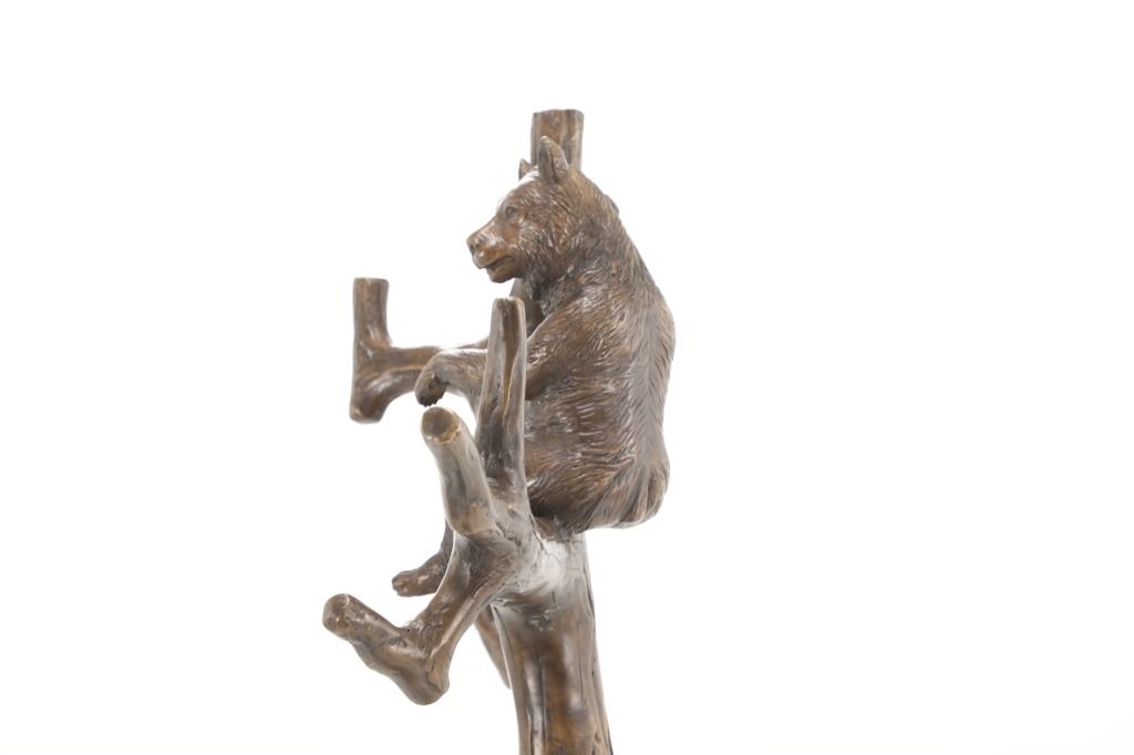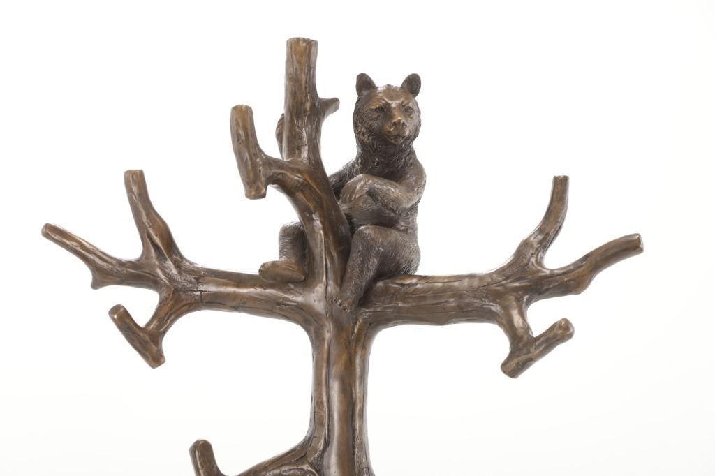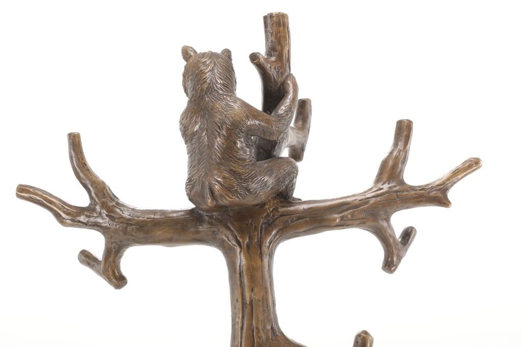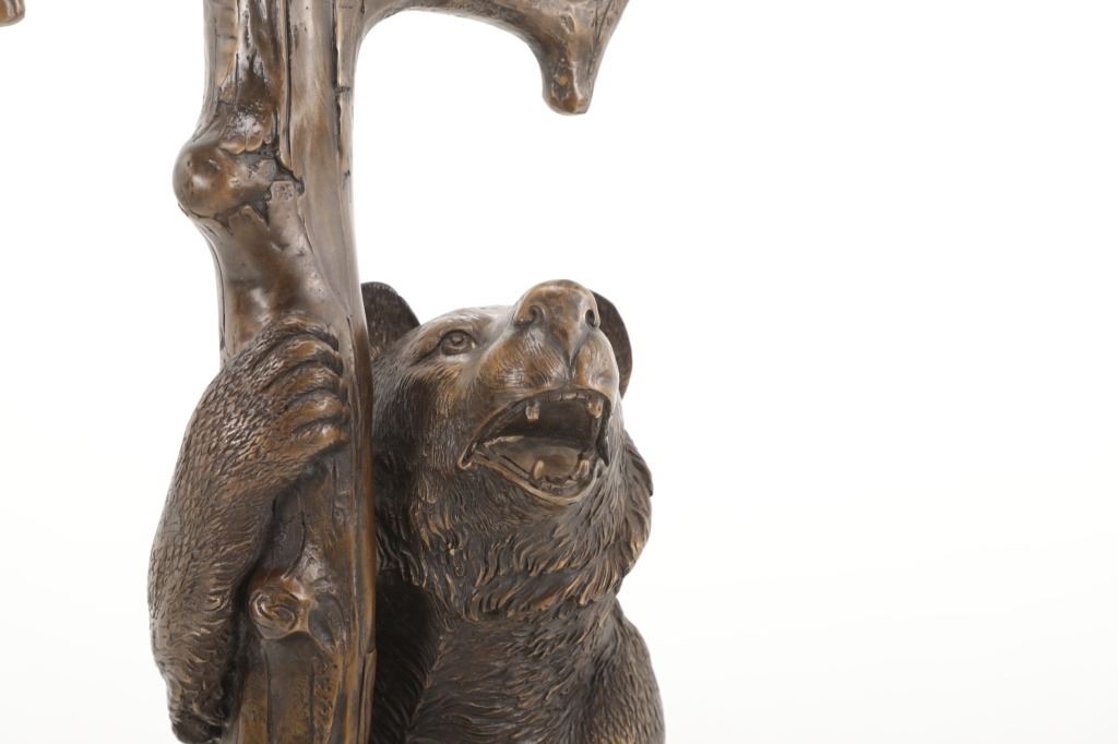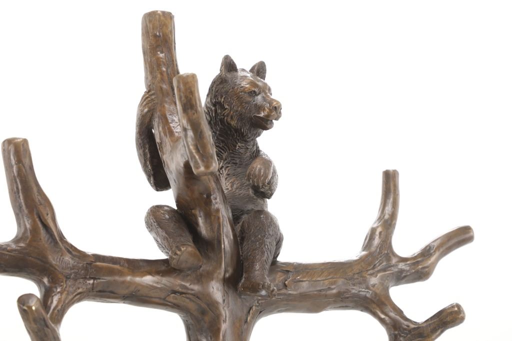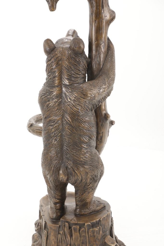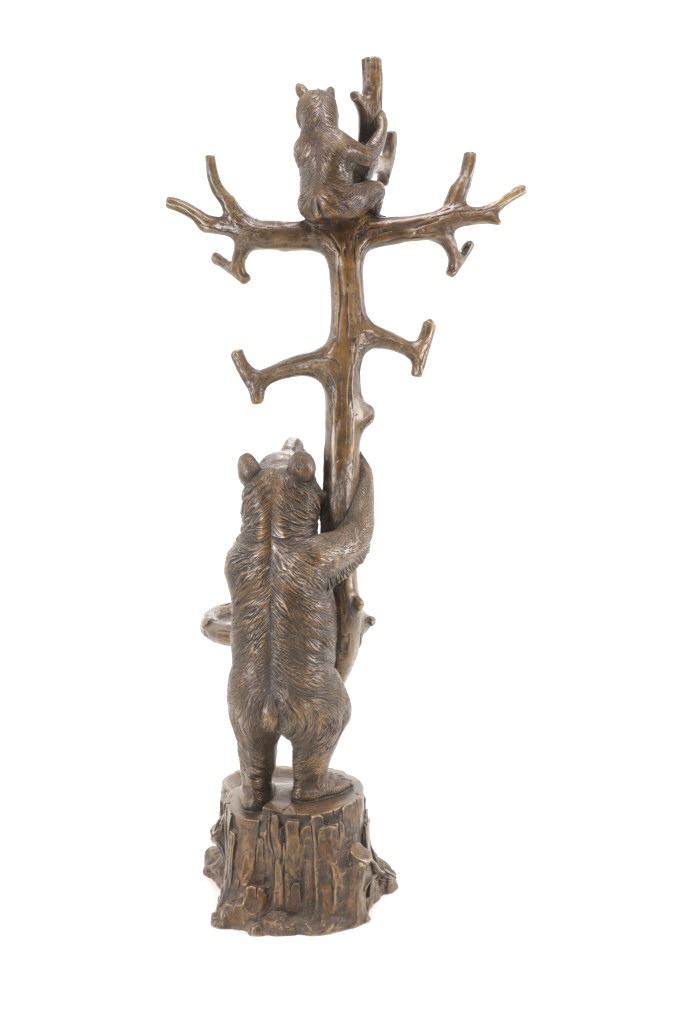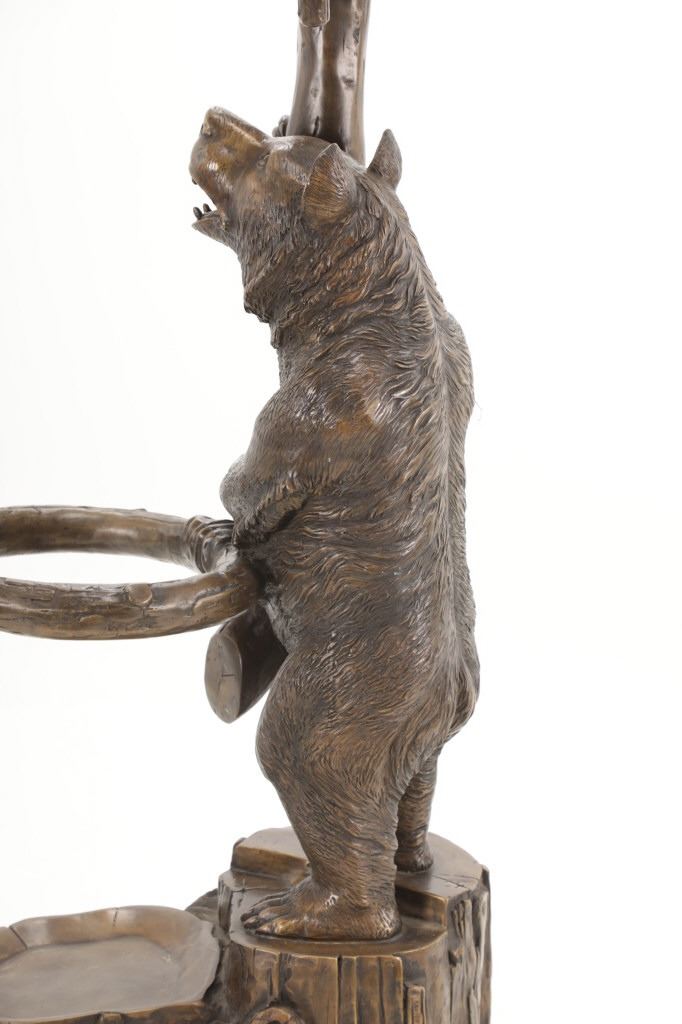 This is an outstanding, large Black Forest bronze hall tree umbrella stand sculpture showing a classic German Black Forest pattern of a Bear and Cub climbing a tree. The piece shows fantastic detail and is an original solid bronze sculpture, life sized in well kept condition. Crafted using top-quality bronze with a brown patina finish, this bear, cub, and tree statue is formed using the classic lost-wax bronze casting method. Measures 69"H x 30"W x 24"D approximately.