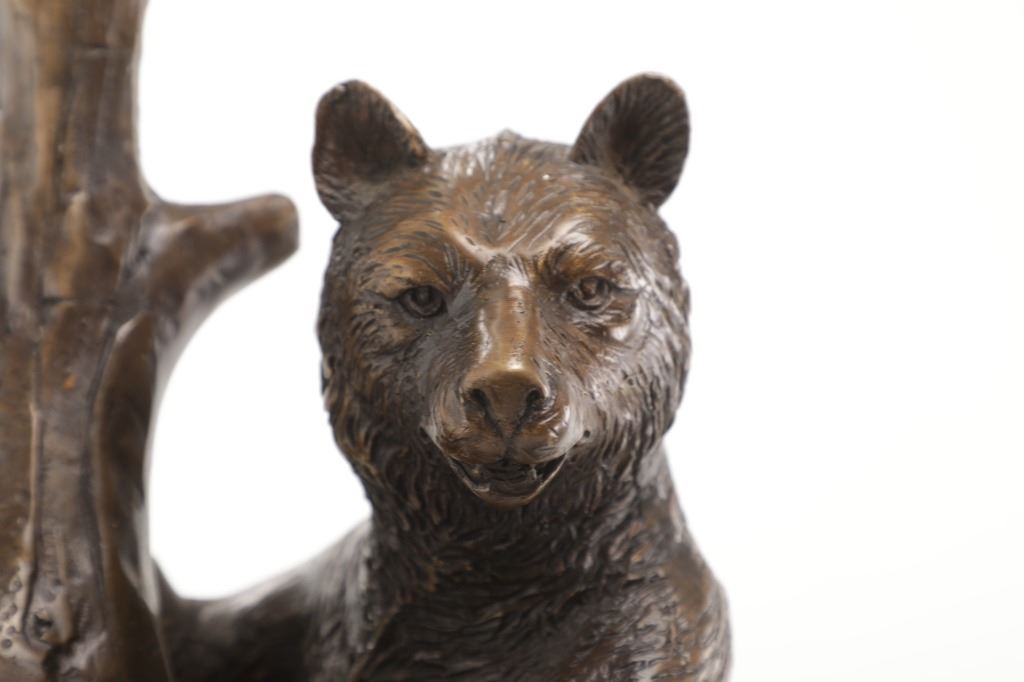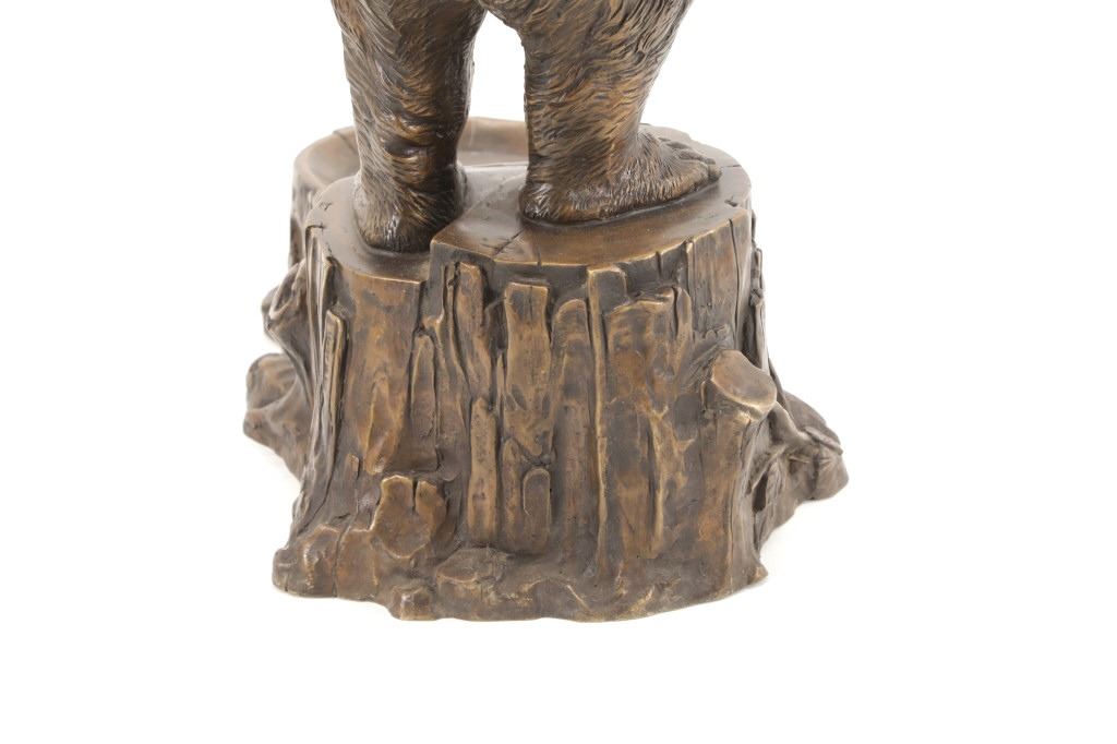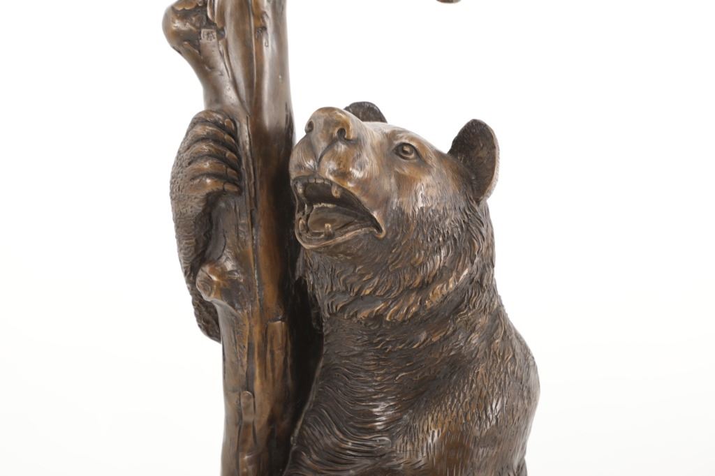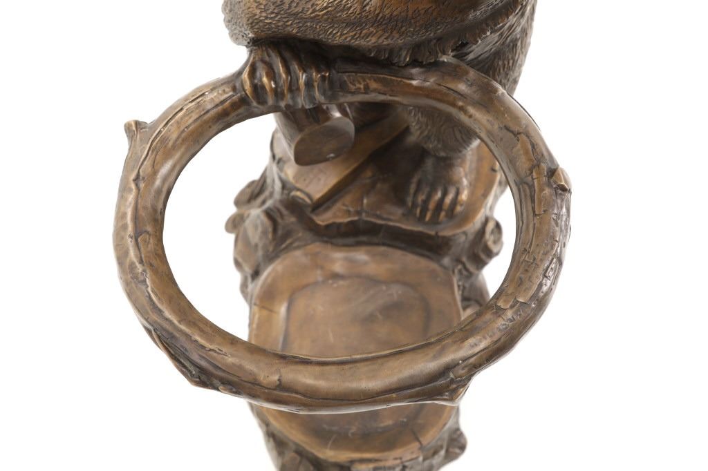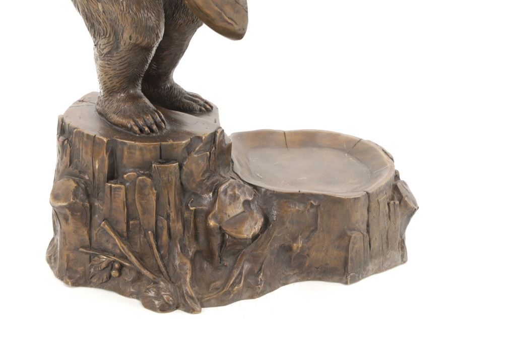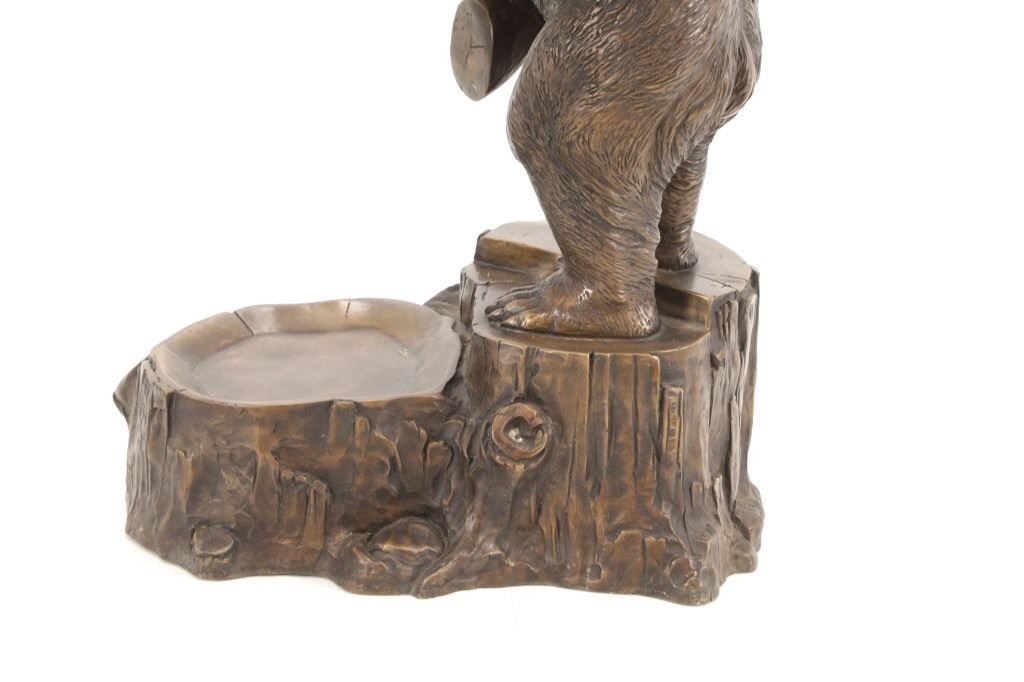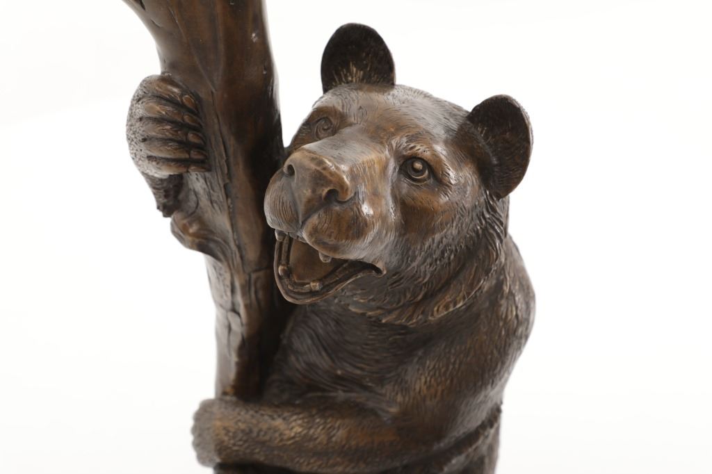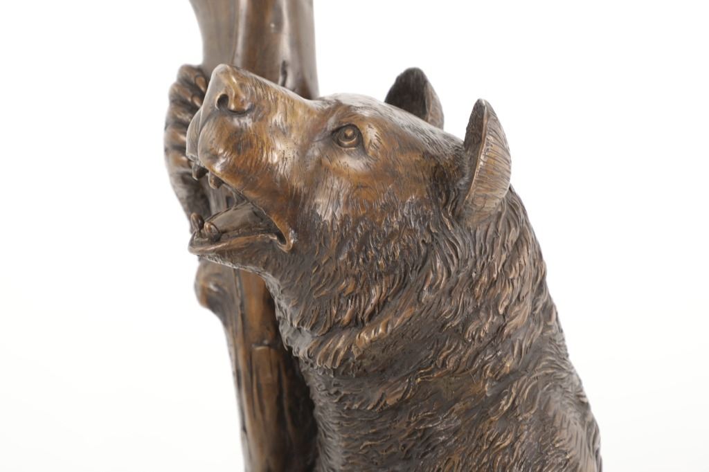 This is an outstanding, large Black Forest bronze hall tree umbrella stand sculpture showing a classic German Black Forest pattern of a Bear and Cub climbing a tree. The piece shows fantastic detail and is an original solid bronze sculpture, life sized in well kept condition. Crafted using top-quality bronze with a brown patina finish, this bear, cub, and tree statue is formed using the classic lost-wax bronze casting method. Measures 69"H x 30"W x 24"D approximately.