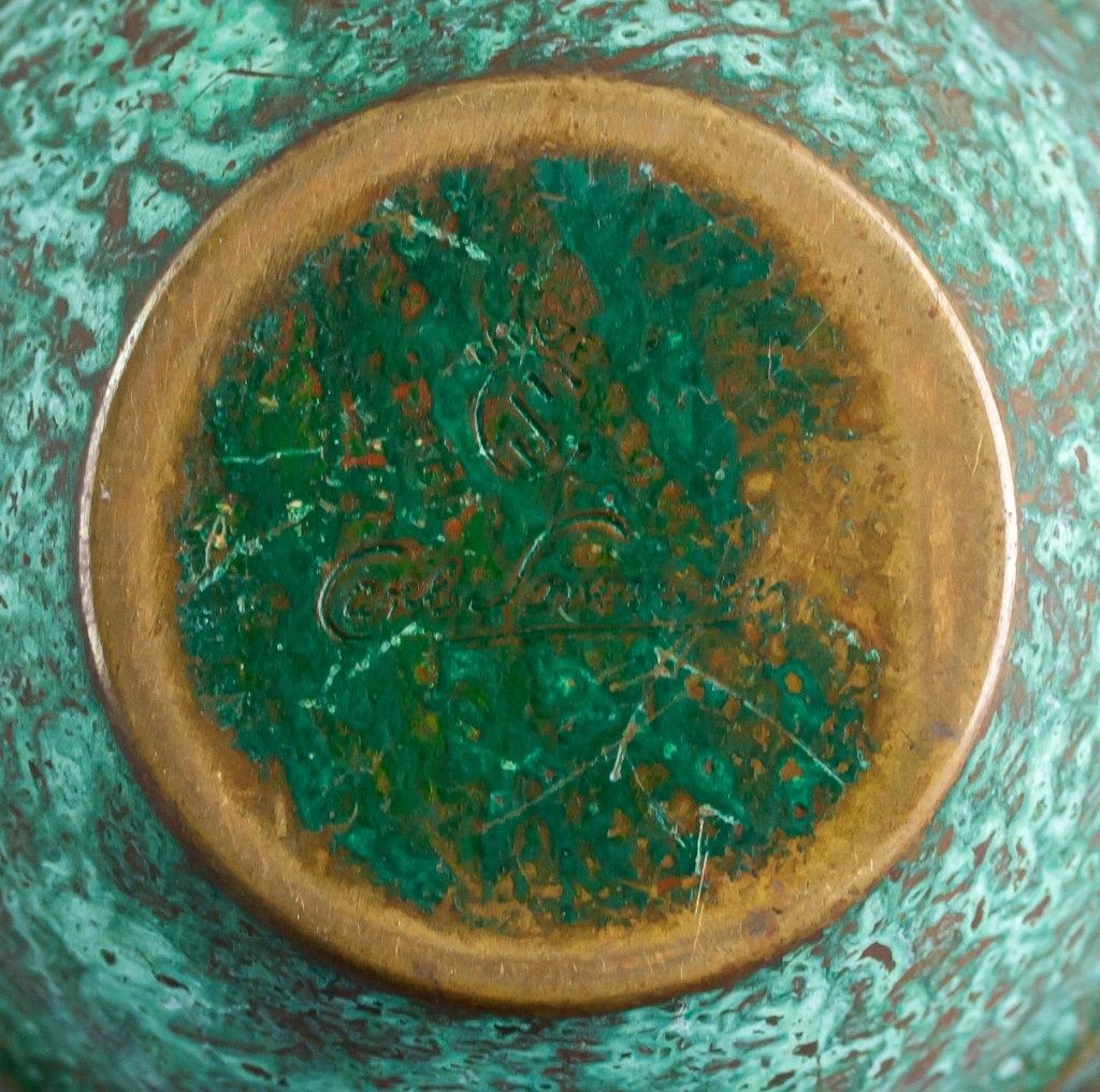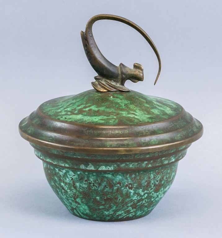 Bronze bowl. With green tarnish. With scorpion-like figure on lid. Mark on base. 14 x 16 cm, 266 grams