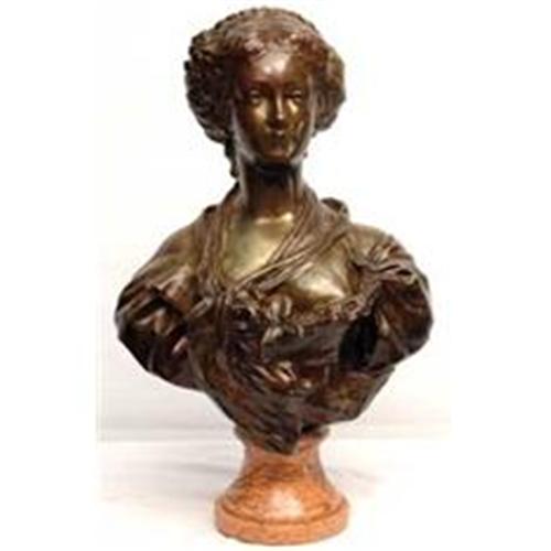 19th Century French bronze sculpture of a female bust. Mounted on an apricot colored marble round base. Signature at base. 35 lbs. Bronze Bust of French Woman on Apricot Marble Base. 23"H 14"W 6"D of base. Fernani Wani D'Greuze.