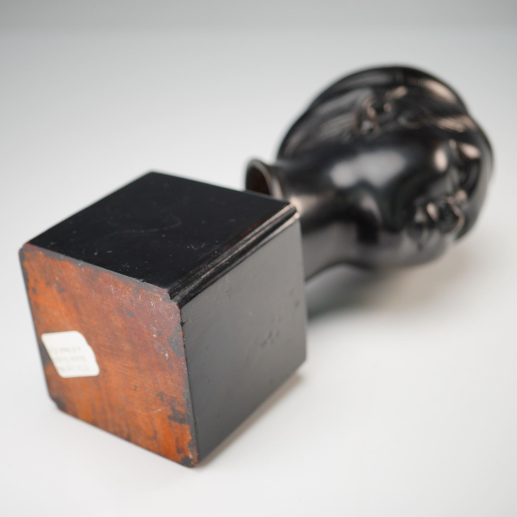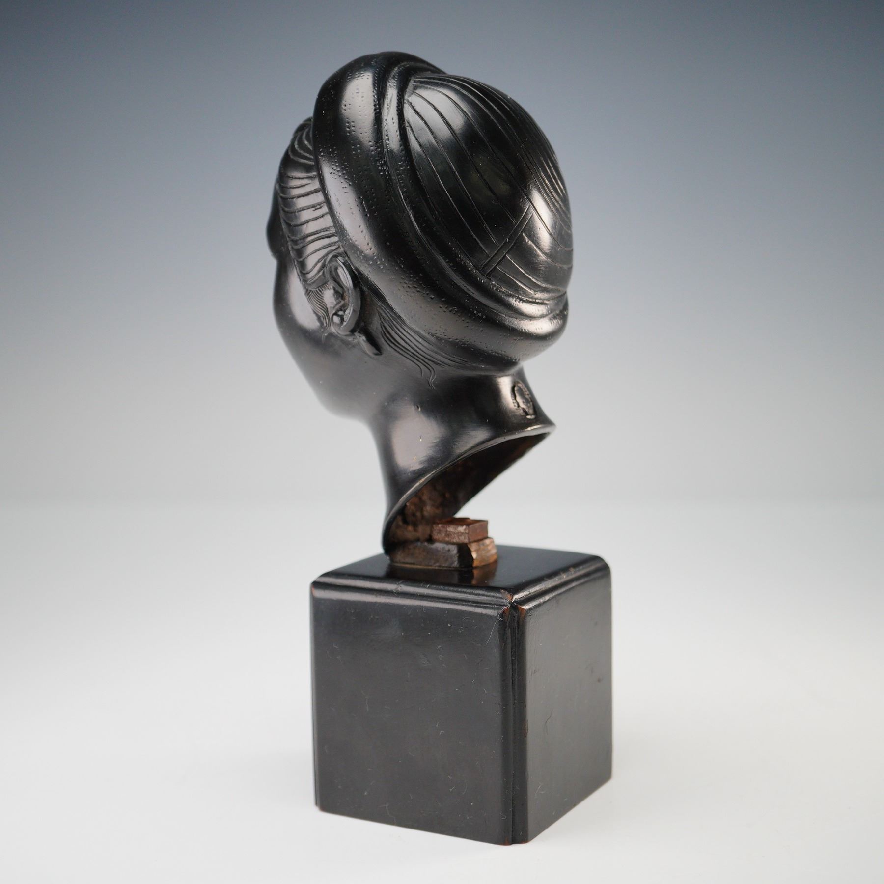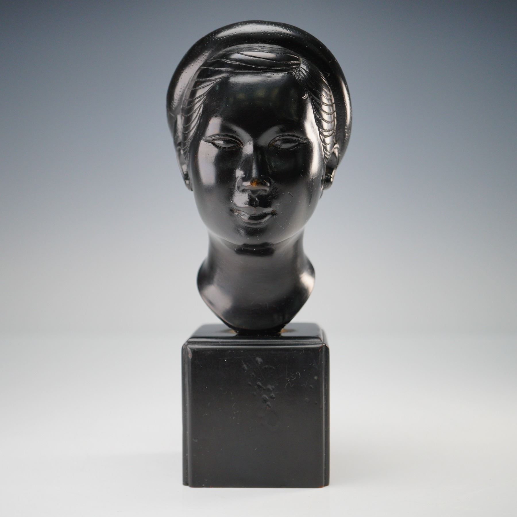 Cast bronze bust of a Vietnamese woman attributed to Thanh Le Nguyen, shown with stylized features and a wrapped hairstyle. Finished in dark patinated bronze and mounted on a square base. Backstamp on the reverse. Measures approximately 7.5"H.