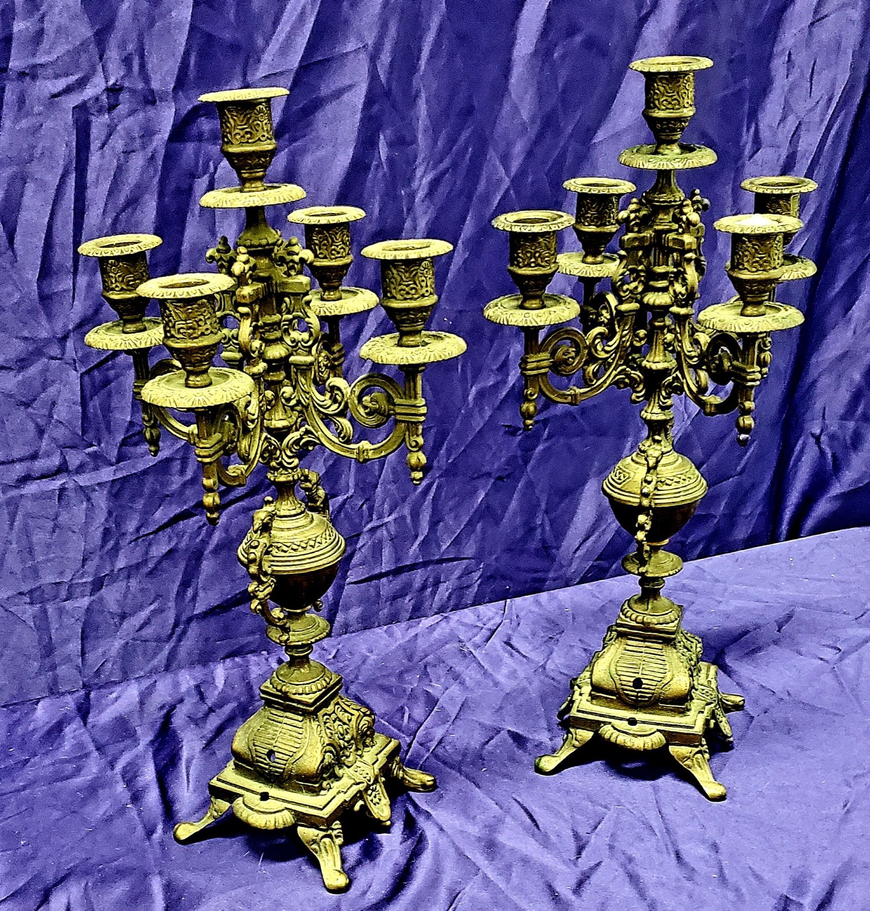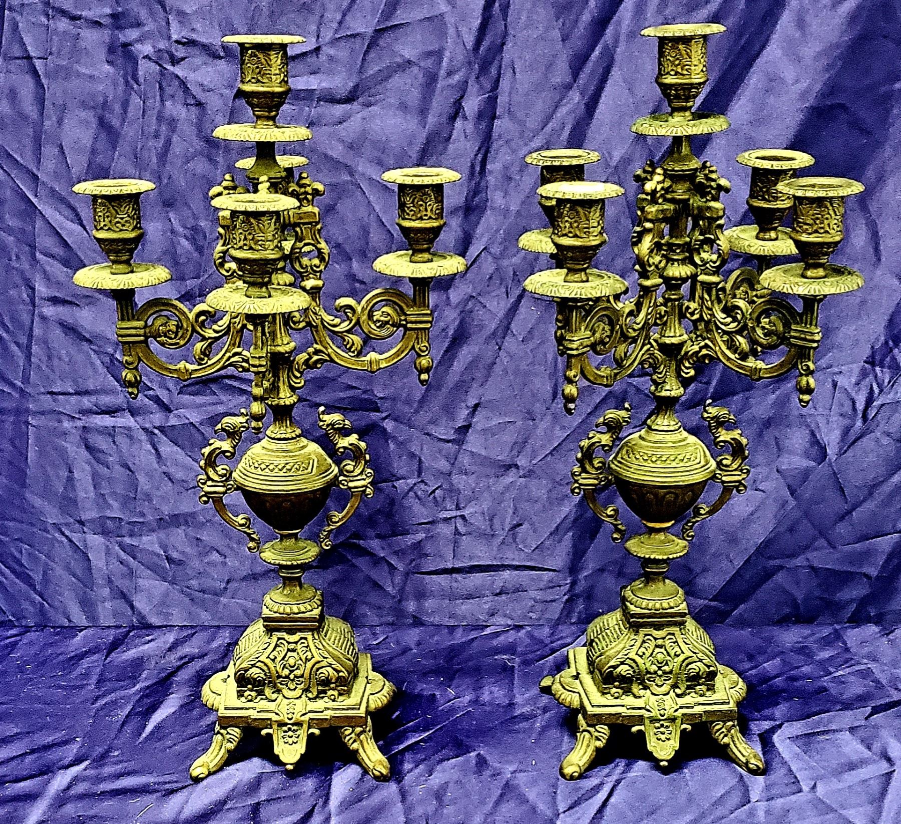 Early 1900's Bronze Candelabras. A 5 head, wonderfully detailed set that has scroll work that is accented with a Peacock theme. Approximately 1.5" H. In very good condition.