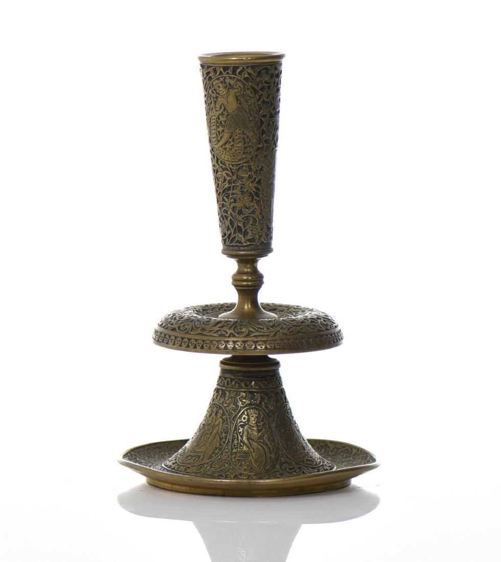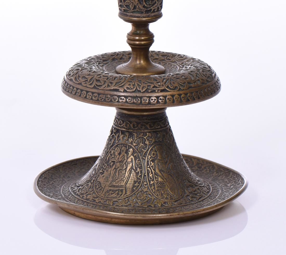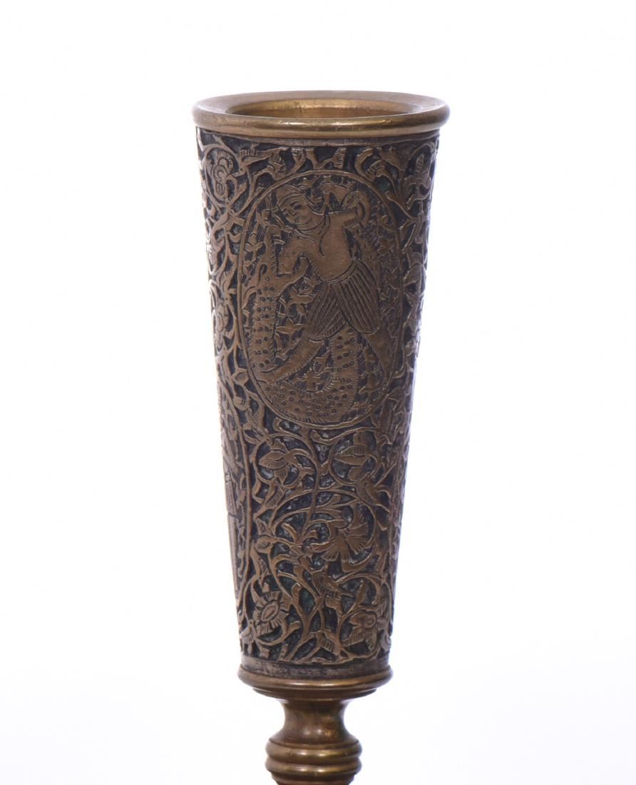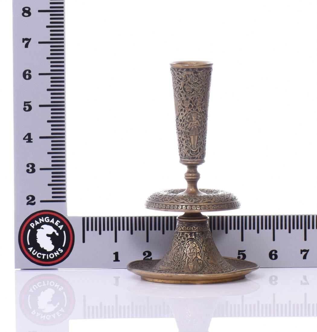 Bronze Candlestick, India. Exquisite Floral Details Throughout On Every Inch Of The Candle Stick With Scenes Of A Warrior With Hand Pushed Down Into The Throat Of A Dragon Serpent, King Sitting On His Throne, Prince Or Soldier Standing With A Sword. The Base Is Adorned With A Hundred Of Faces And Scenes Of Matriarchs Riding Animals And Wearing Costumes. A Spectacular Work Of Art. Estimated more than 100 yrs old. Indian art consists of a variety of forms, including pottery, sculpture, paintings, and textiles. Geographically, it spans the entire Indian subcontinent, including what is now India, Pakistan and Bangladesh. A strong sense of design is characteristic of Indian art and can be observed in its modern and traditional forms. The origin of Indian art can be traced to pre-historic Hominid settlements in the 3rd millennium BC. On its way to modern times, Indian art has had cultural influences such as Indus Valley and Hellenistic, as well as religious influences such as Hinduism, Buddhism, Jainism and Islam. In spite of this complex mixture of religious traditions, generally the prevailing artistic style at any time and place has been shared by the major religious groups. In historic art, sculpture in stone and metal, mainly religious, has survived the Indian climate better than other media, and provides most of the best remains. Many of the most important ancient finds that are not in carved stone come from surrounding, drier regions rather than India itself. (Wikipedia) Size: See Ruler Photo. (Photos Represent The Condition Of The Lot.)