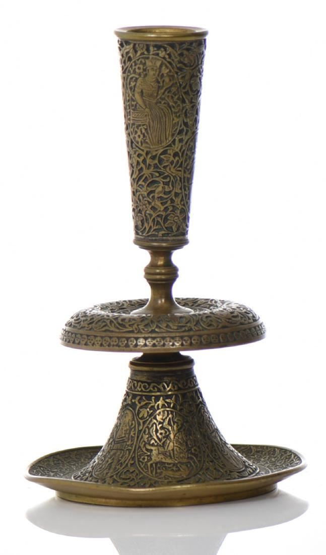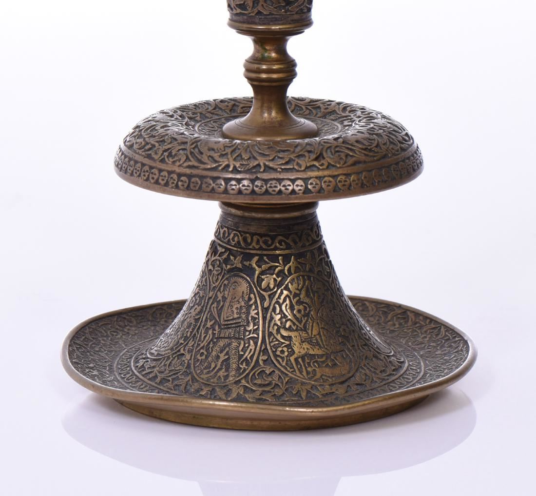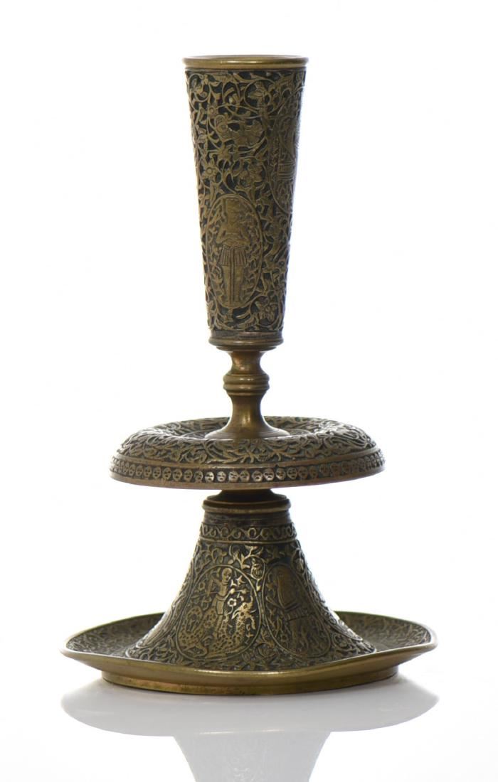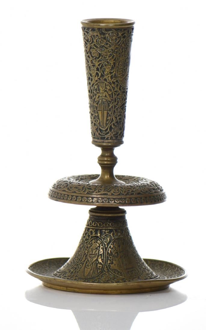 Bronze Candlestick, India. Exquisite Floral Details Throughout On Every Inch Of The Candle Stick With Scenes Of A Warrior With Hand Pushed Down Into The Throat Of A Dragon Serpent, King Sitting On His Throne, Prince Or Soldier Standing With A Sword. The Base Is Adorned With A Hundred Of Faces And Scenes Of Matriarchs Riding Animals And Wearing Costumes. A Spectacular Work Of Art. Estimated more than 100 yrs old. Indian art consists of a variety of forms, including pottery, sculpture, paintings, and textiles. Geographically, it spans the entire Indian subcontinent, including what is now India, Pakistan and Bangladesh. A strong sense of design is characteristic of Indian art and can be observed in its modern and traditional forms. The origin of Indian art can be traced to pre-historic Hominid settlements in the 3rd millennium BC. On its way to modern times, Indian art has had cultural influences such as Indus Valley and Hellenistic, as well as religious influences such as Hinduism, Buddhism, Jainism and Islam. In spite of this complex mixture of religious traditions, generally the prevailing artistic style at any time and place has been shared by the major religious groups. In historic art, sculpture in stone and metal, mainly religious, has survived the Indian climate better than other media, and provides most of the best remains. Many of the most important ancient finds that are not in carved stone come from surrounding, drier regions rather than India itself. (Wikipedia) Size: See Ruler Photo. (Photos Represent The Condition Of The Lot.)