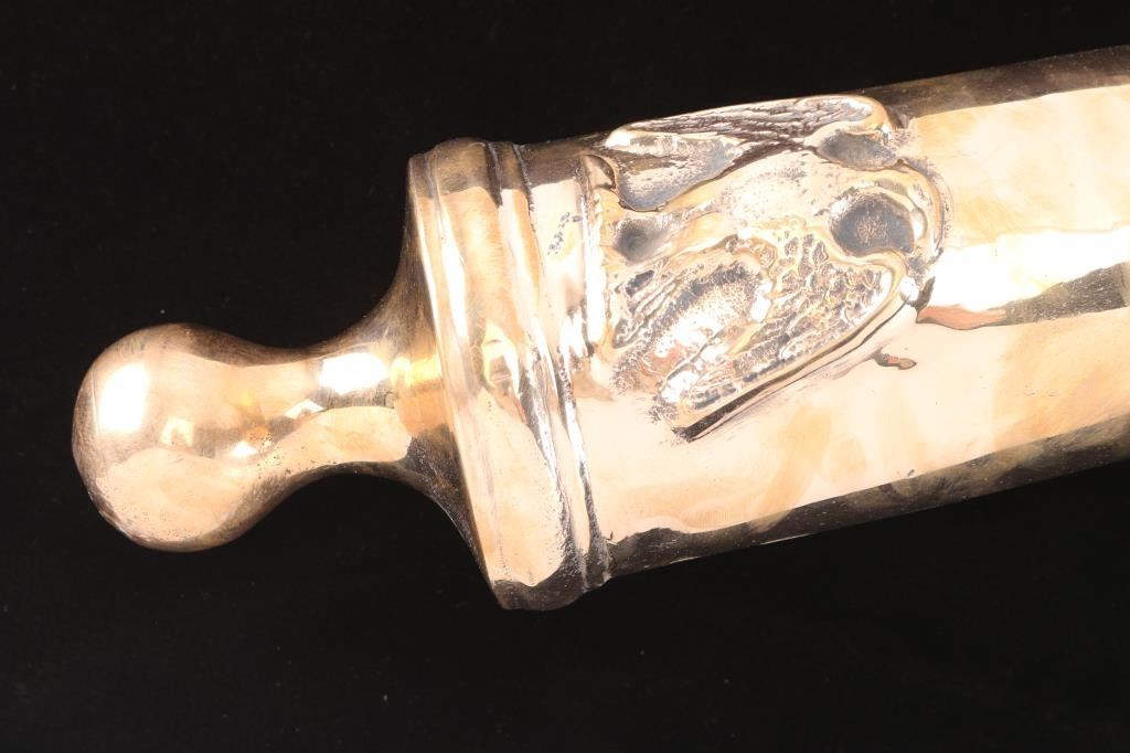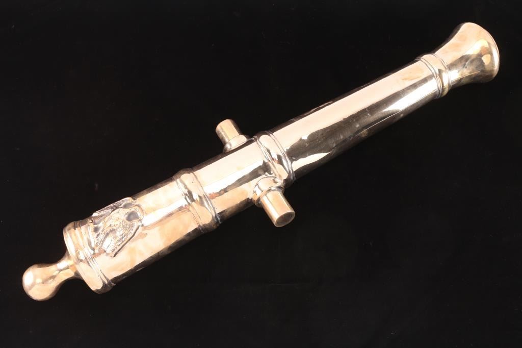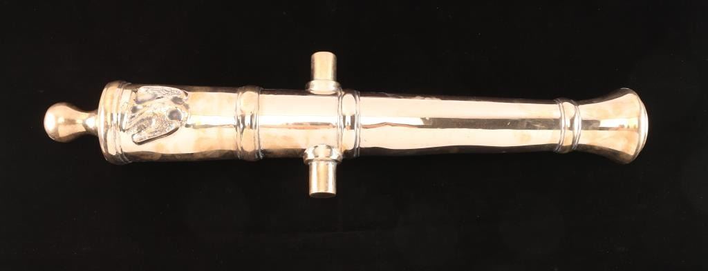 Unmarked bronze cannon, highly polished with ornate eagle crest at rear. No carriage. Appears to be non-firing w/no vent. Measures: 36" overall, 5" base, 9" trunnion end to end, 5" chase width, 2" bore Dia. Wt. approx. 88Lbs. NOTE* Buyer must make arrangements for shipping or local pickup.