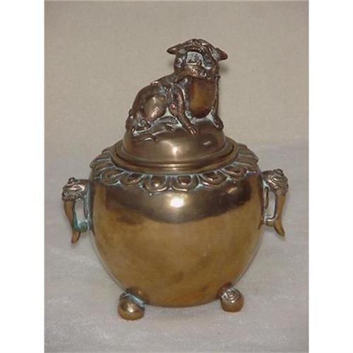 An antique bronze censor, 6 3/4" tall, 5 1/4" wide. The censor is a 19th century piece, unfortunately someone has polished the patina off and exposed the bare bronze. The patina can be restored and it would certainly increase the beauty of the censor which is quite a handsome one, the lid holds a very nice fu lion and close inspection shows its quality. The body of the censor has three feet and elephant head handles.