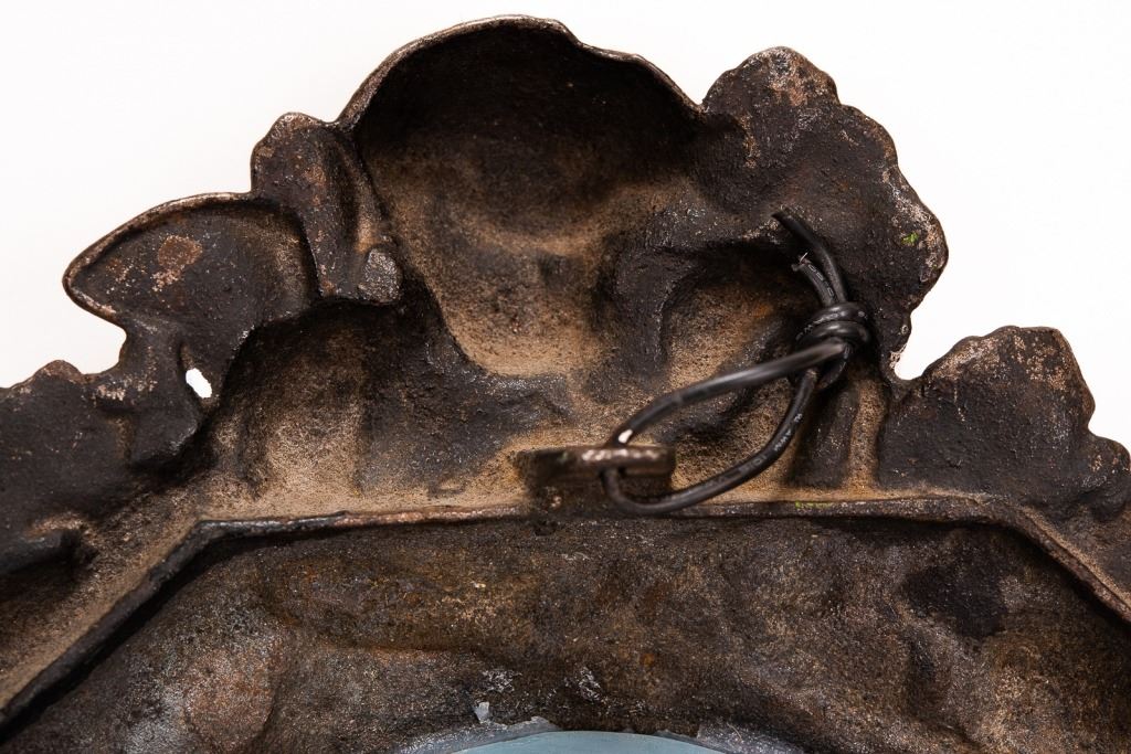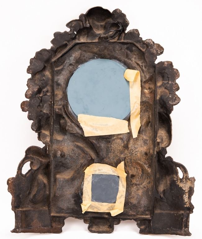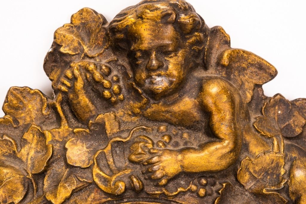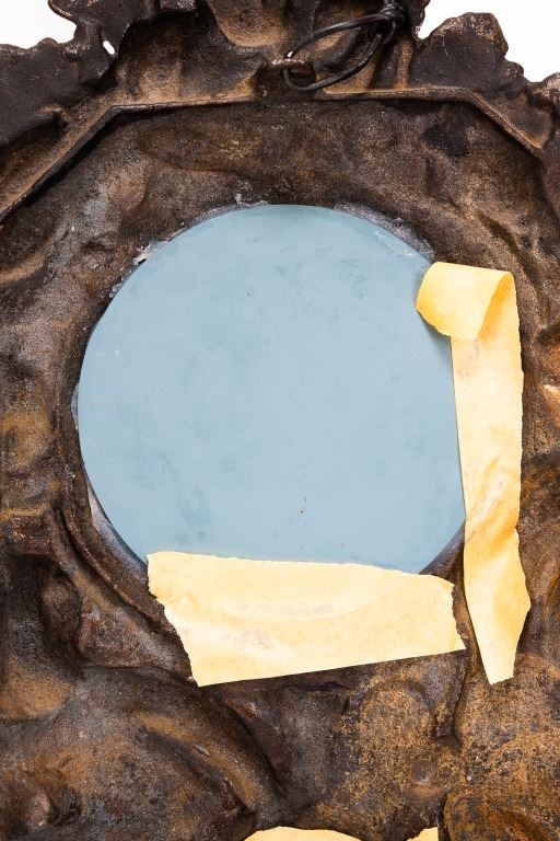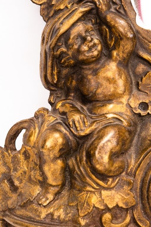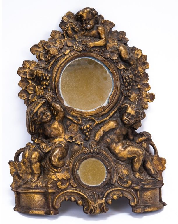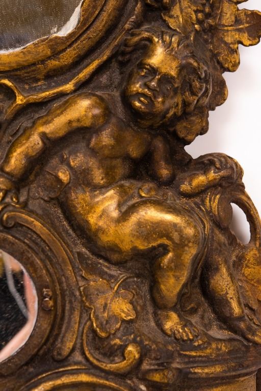 Item/Description: Bronze clock face has been repurposed as a hanging wall mirror. Adorned with three puti (cupids) and grape leaves. No noticeable makers marks.