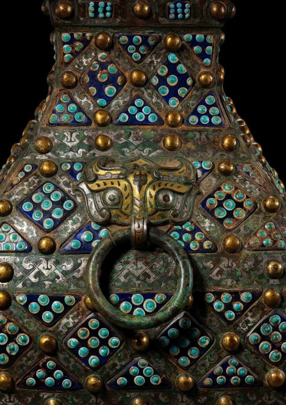 This bronze square vase features exquisite cloisonné inlay with gold and silver, adorned with intricate dragonfly-eye patterns, creating a striking visual impact. The unique square shape, combined with the gold and silver inlay craftsmanship and the bronze base, reflects the superb skills and artistic pursuits of ancient artisans, making it an elegant and captivating collectible piece.
