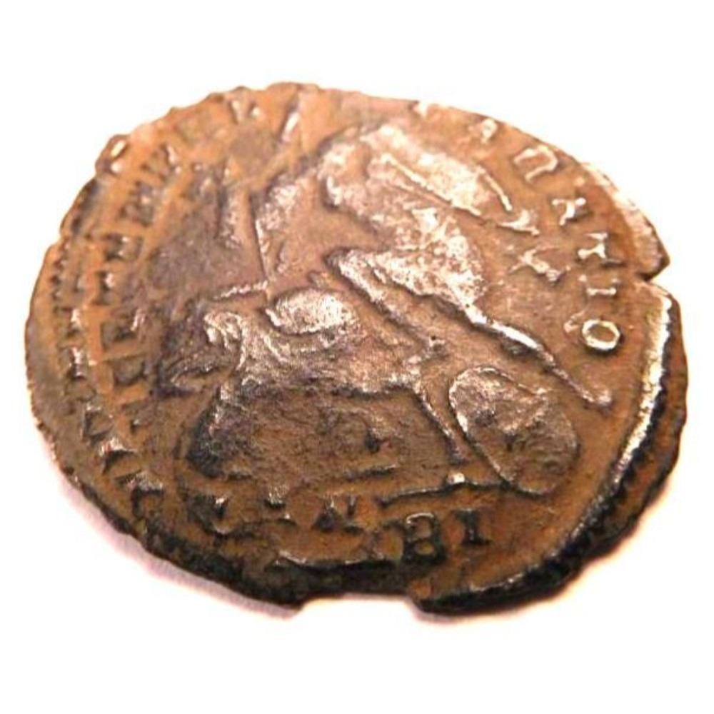 The reverse of this coin shows the emperor stabbing a hapless victim to death, a gruesome act by today's standards, but not apparently during the Roman Empire: the legend reads FEL TEMP REPARATIO, meaning roughly "the return of happy times" (!). Constantius II, born in 317 A.D., was the second of three sons born of Constantine the Great. He initially ruled alongside his brothers Constantine II and Constans. When Constanstine II was defeated by Constans, the latter gained sole control of the western empire, leaving Constantius II to rule the eastern territories. When Constans was himself later defeated by the usurper Magentius, Constantius successfully attacked Magentius, becoming sole Augustus. Constantius II issued a tremendous amount of coinage, and his coins are among those most commonly found in hoards. He fell ill and died in 361 A.D. JC-30101-91 JC-30191