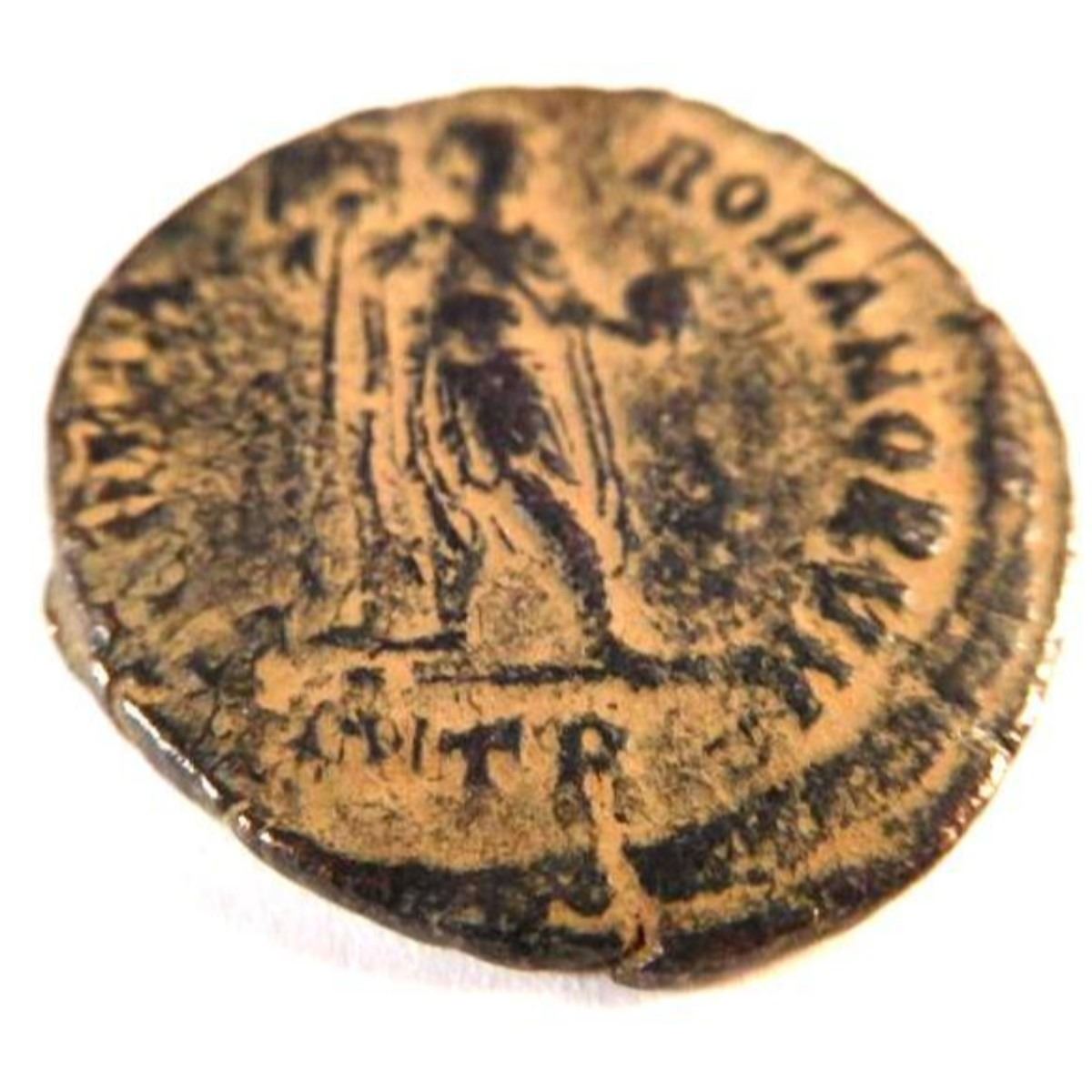 The reverse depicts the emperor standing, and reads GLORIA ROMANORVM "the glory of Rome". Honorius was born on September 9, 384 A.D., the younger brother of Arcadius, and son of Theodosius I. Unlike Arcadius, Honorius was a comparatively strong ruler, holding power for some 30 years. Yet his reign was marked by the sacking of Rome, an event not theretofore witnessed for many centuries. He died in 423, leaving no heir. JC-30101-56 JC-30156
