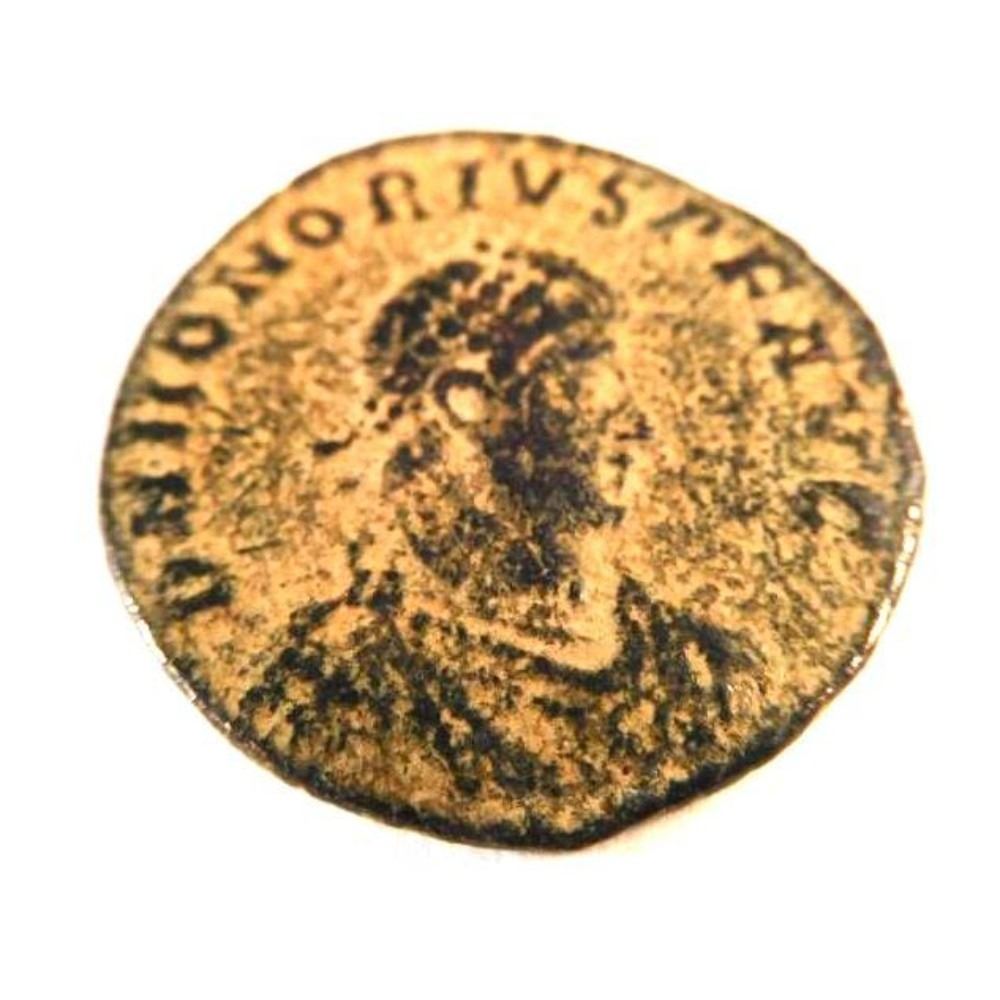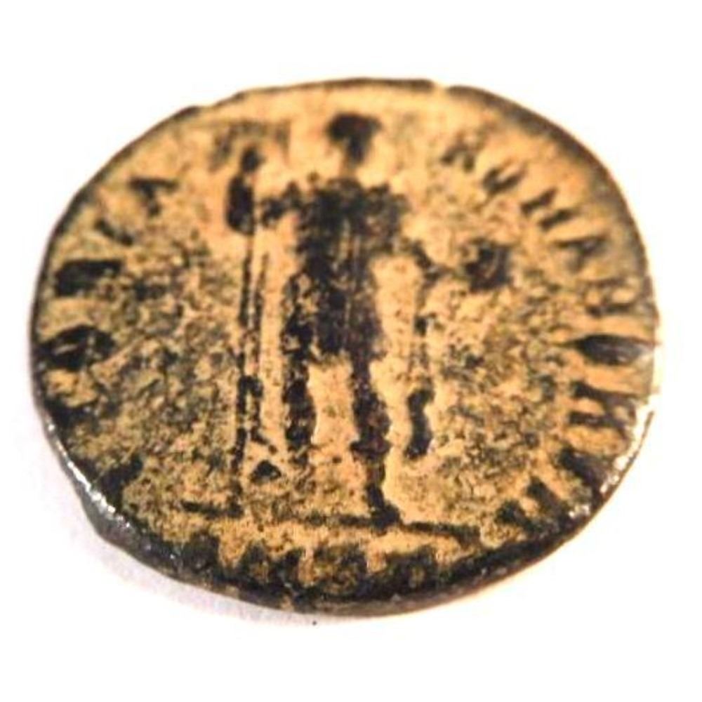 The reverse depicts the emperor standing, and reads GLORIA ROMANORVM "the glory of Rome". Honorius was born on September 9, 384 A.D., the younger brother of Arcadius, and son of Theodosius I. Unlike Arcadius, Honorius was a comparatively strong ruler, holding power for some 30 years. Yet his reign was marked by the sacking of Rome, an event not theretofore witnessed for many centuries. He died in 423, leaving no heir. JC-30101-55