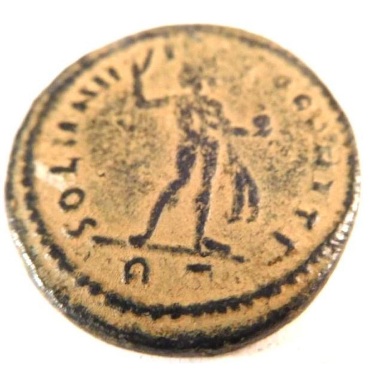 Maximian, not to be confused with 2nd century emperor Marcus Valerius Maximianus, was born in about 250 A.D. His reign is noteworthy for the fact that he ruled during three different intervals. From 286 to 305 A.D., under Diocletian, he was Caesar and then Augustus in the east. From 306 to 308 A.D. he was self-proclaimed Augustus. And in 310 A.D. again declared himself Augustus. The first two of these three reigns ended in his forced abdication. The third ended with his suicide in 310 A.D., at the command of Constantine the Great. The reverse reads SOL INVICTO COMITI ("committed to the invincible sun"), paying to homage to Sol, god of soldiers. ?This coin measures roughly 25 mm. ? JC-30101-67