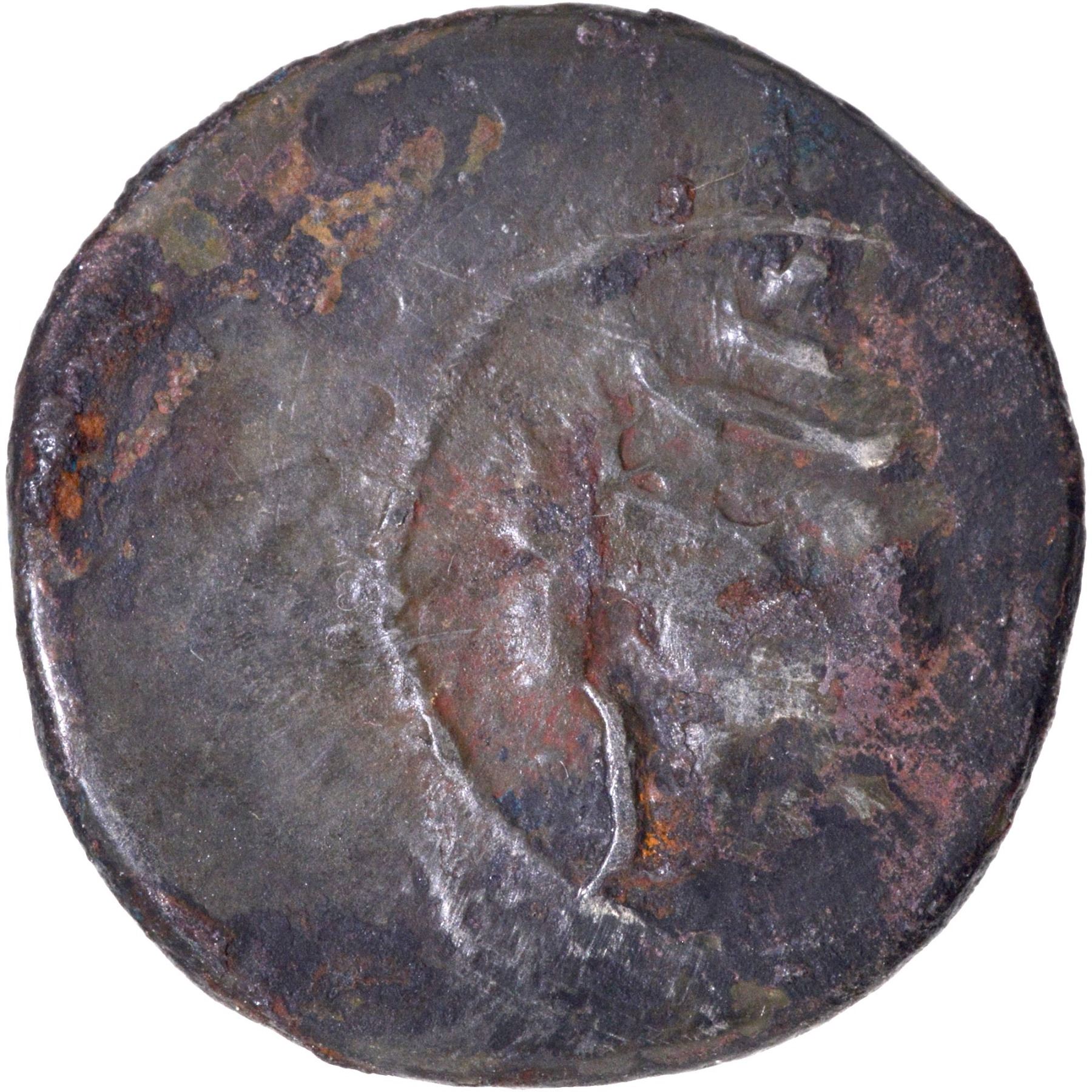 Pallavas of Kanchi (4-6 Century CE), Bronze Unit, Obv: an upright bull facing right, a club in front of it, snake, Srivatsa, conch shell and crescent symbols above, a beaded border around the field, Rev: a conch shell (Shankha) in the center, a linear border around the field, 3.67g, 19.6mm, (The Pallava Coins, R. Krishnamurthy # 192), all symbols clearly visible, completely struck, about very fine, Very Rare.
