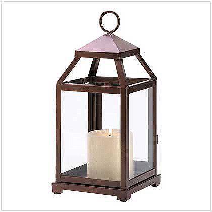 Bronze Contemporary Lantern **|**|** A burnished copper glaze brightens the modernized framework of this glass-paneled hurricane lamp, making it the perfect finish for any special setting. A handsomely understated addition to your favorite room! Loop at top for hanging; can also stand freely on table or shelf. 5 x 5" x 12" high. Iron and glass. Candle not included"