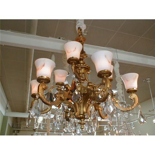 Bronze & Crystal Chandelier with Faux Alabaster Shades.  Rewired US. Up to 60 watts per bulb.  The share are faux alabaster which is a plus.  Real alabaster would need a lower wattage bulb to prevent damage to the shade.  There are 3 down light that doe not have any shade.  You could use a decorative bulb.  The crystals are large & chunky  in clear and amber color. Bronze is gold tone. This item is as shown in photos. No other crystals or parts.  This chandelier requires professional packaging and insured shipping for long distance or local purchase.