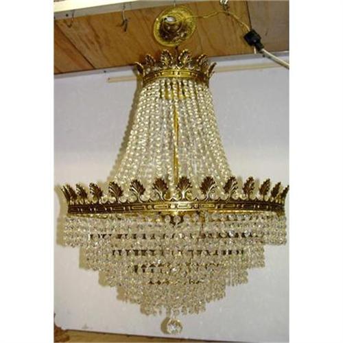 Outstanding 10 light acanthus leaf adorned crown and stylized ceiling cap complemented by flowing strands cascading crystal culminating in a crystal ball. This chandelier would create a magnificent ambiance in that special room in your house or restaurant. Size: 29 inches, 23 inches (diameter)