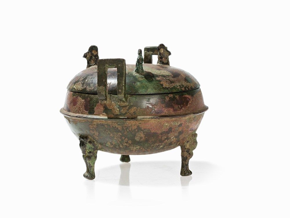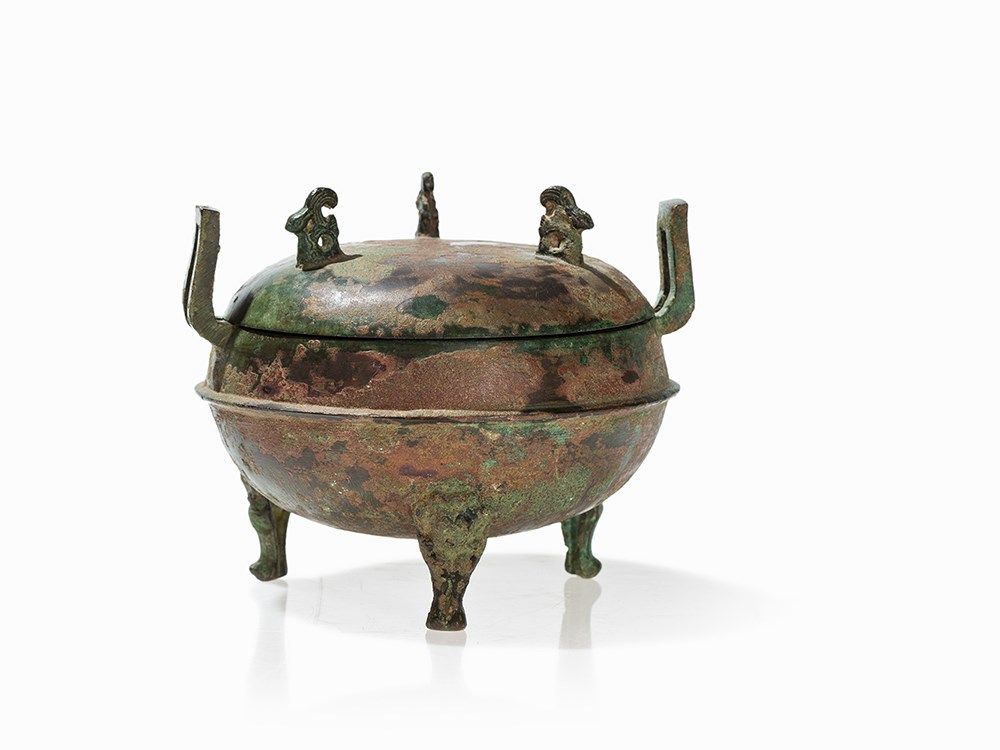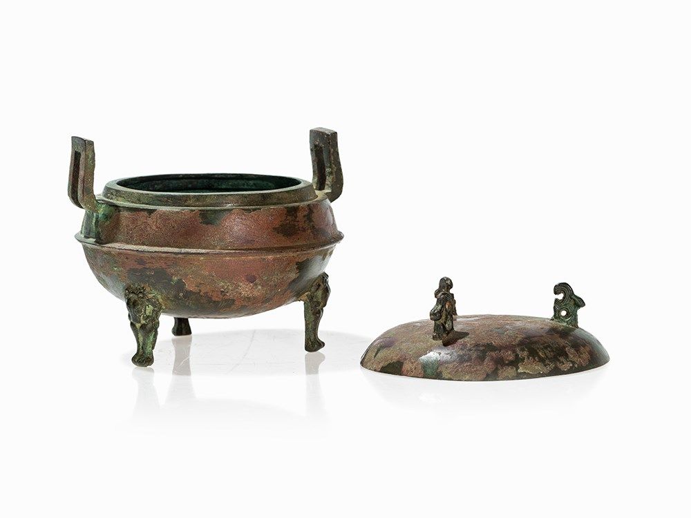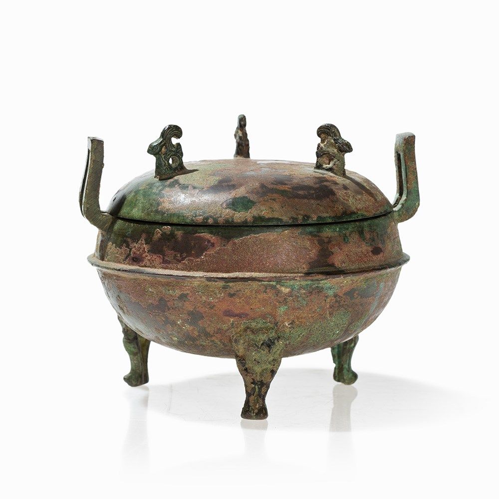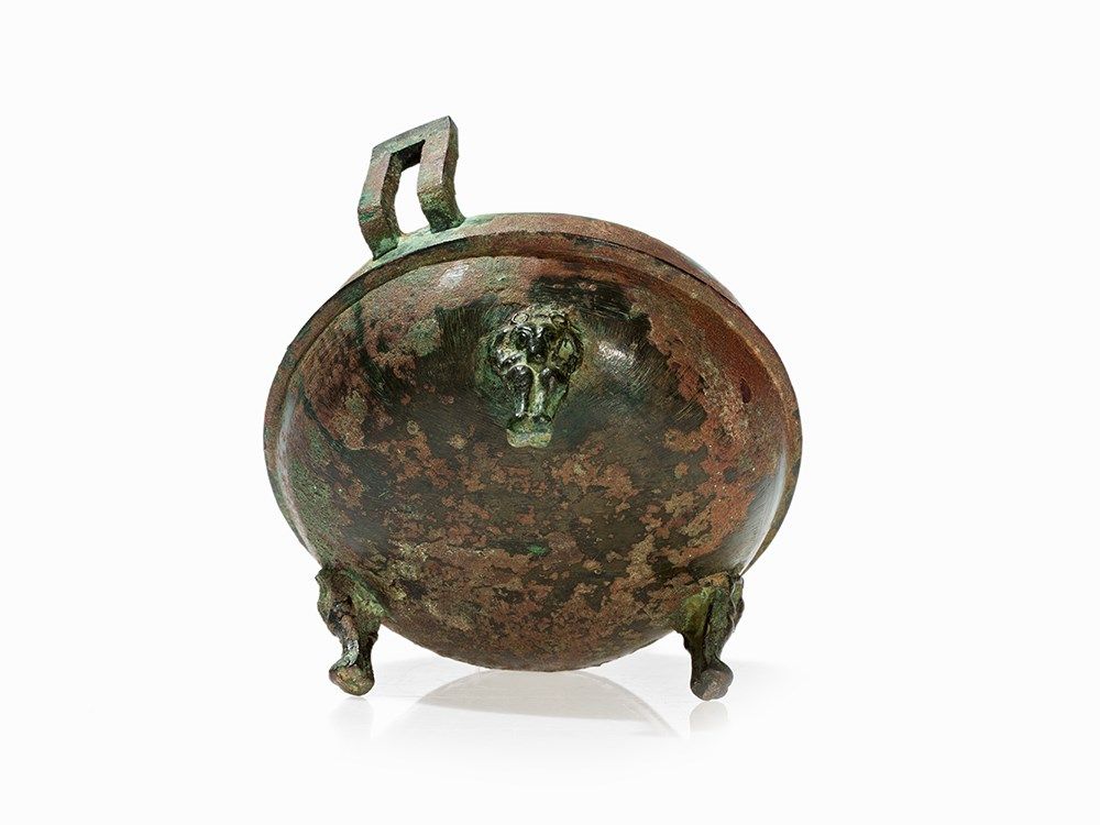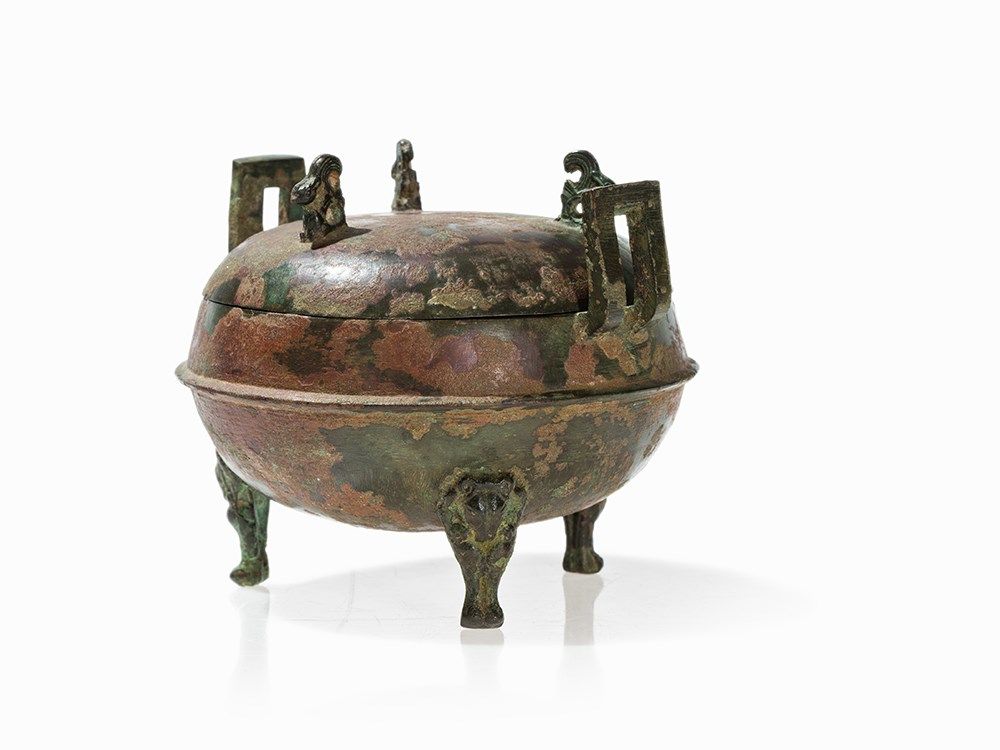 Because of its bear-shaped legs such bronzes were extremely popular during the Han Dynasty and also a typical motif of the metalwork in the Han Dynasty. The bears are used in their abstract form not only at bronze vessels but also enjoyed great popularity at ceramic vessels. They were created in the context of an awakening interest in sculptural representations of nature. A comparable bronze DING with legs in the shape of bears is found in Zhonguo Zhongda kaogu Faxian, Beijing 1990, p 144.