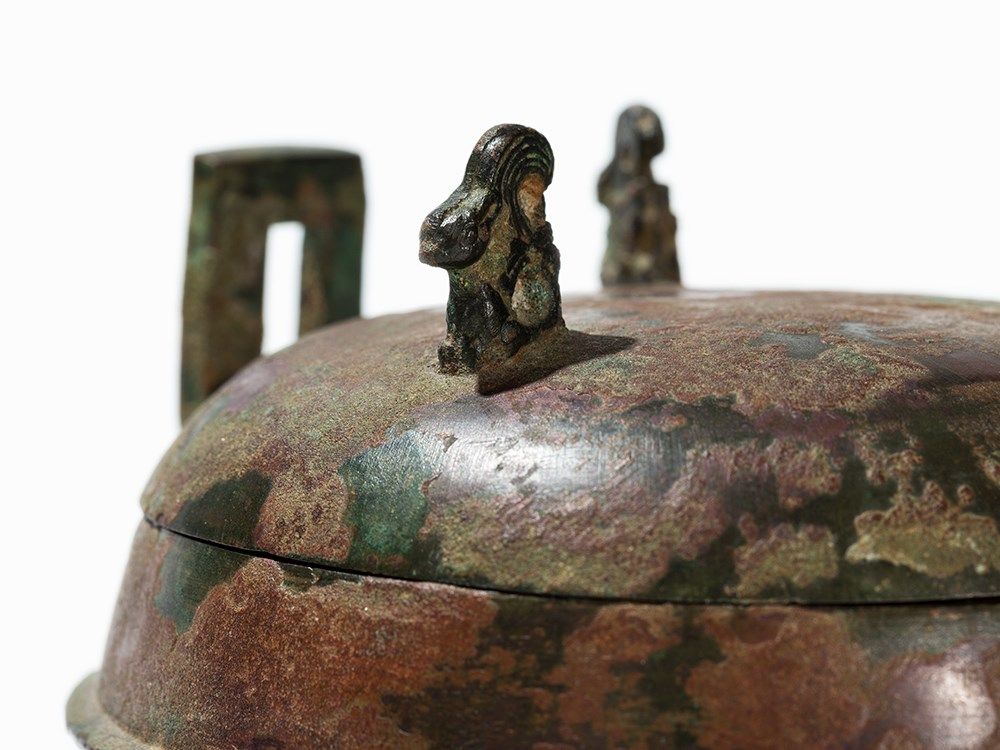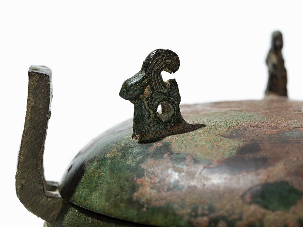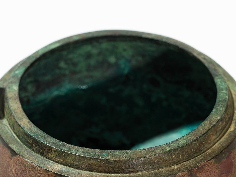 Condition: The bronze vessel is in good condition for its age with hardly any signs of wear and a striking, authentic patina. The height measures 14 cm.
