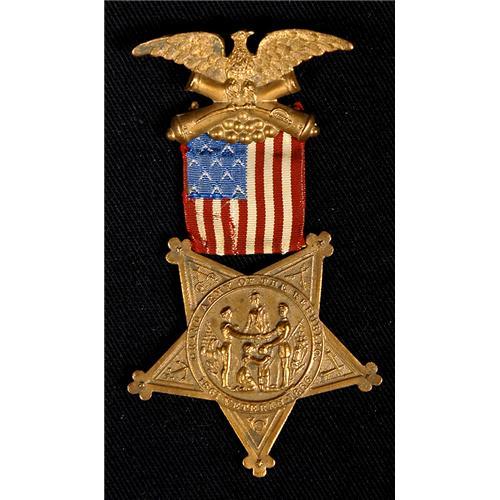 <Our item number 140711><B>Civil War Veteran's Medal.</B> Bronze eagle holding cross cannons with cannon balls attached by a colorful linen American flag connecting to a five point star. Enscribed on the star is "Grand Army of the Republic 1861 - Veteran - 1866". All Union veterans who served in the Civil War were given these metals from 1866 on. <BR>Estimated Value $150 - 250. <BR><BR>Our item number 140711<BR><IMAGES><P ALIGN="CENTER"><IMG SRC="http://www.goldbergcoins.net/liveauction/49jpegs/140711.jpg"> </P></IMAGES>