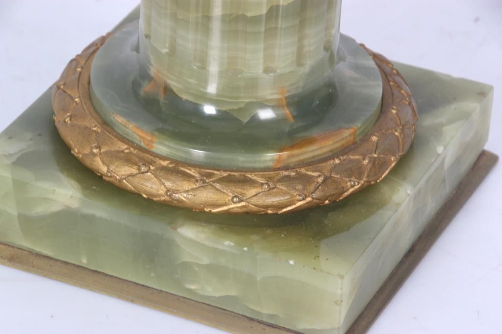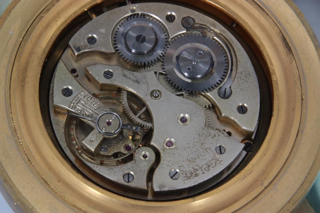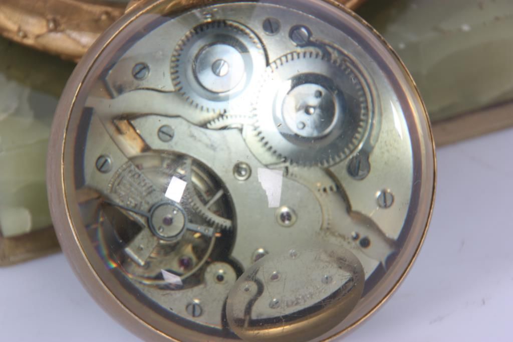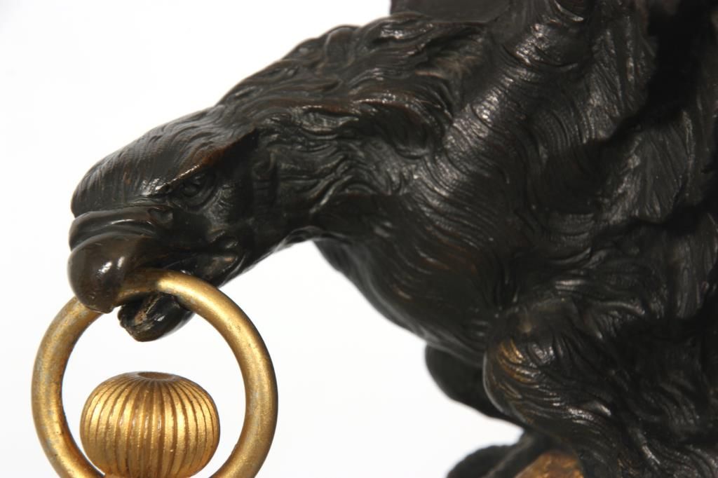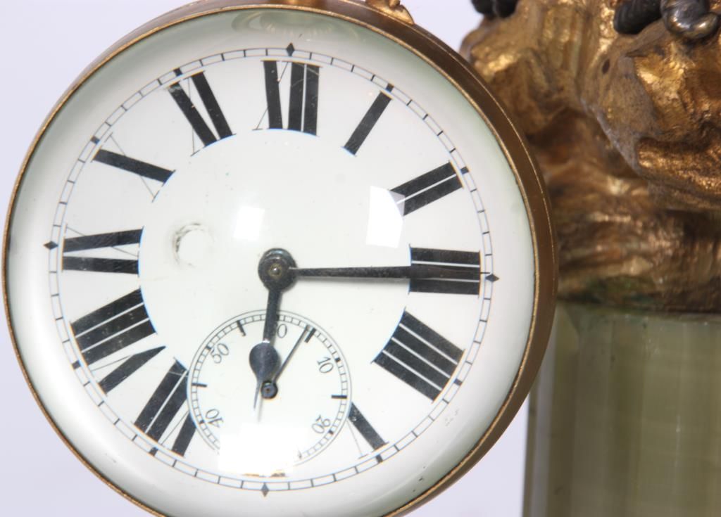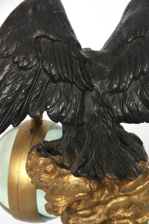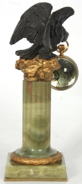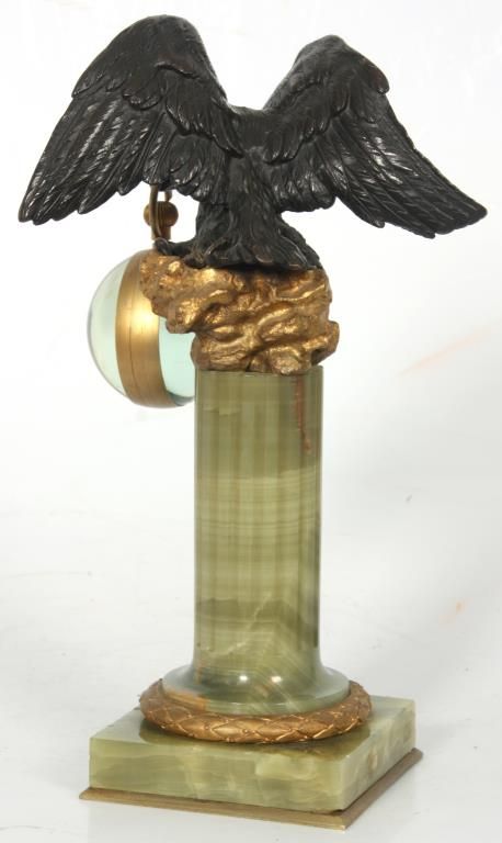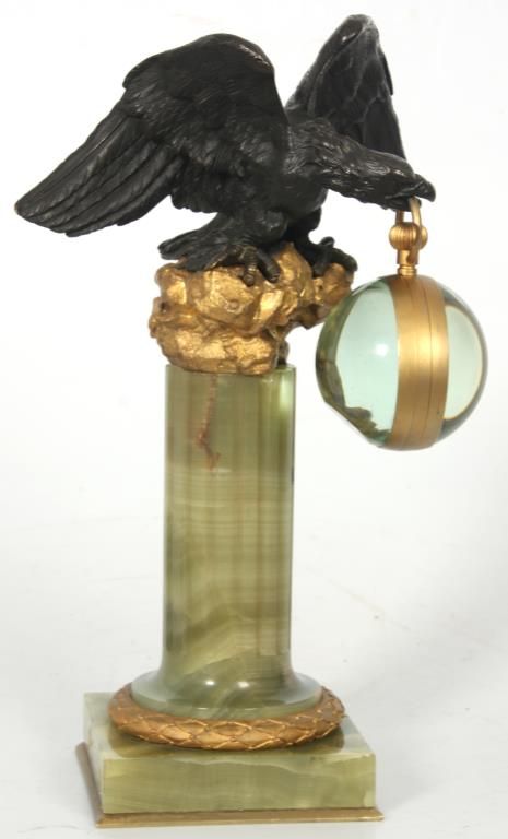 Bronze Eagle & Onyx Pedastal Glass Ball Clock. Figural gilt bronze eagle stands perched on a rock structure with spread wings, body turned to the its right and head cocked forward, has a deep brown patina on the figure and gilt finish on the rock structure; raised on a turned & fluted green onyx pedestal and square base. In its mouth the eagle holds a hanging spherical timepiece, magnifying glass ball front and back has a 3.5 in. dia. with Roman hour numerals on the dial and sub seconds dial; movement has a lever escapement with jeweled pallets, good balance wheel swings freely with nice brisk motion, winds from the crown at the top of the sphere and has a pin-set mechanism. Movement is signed Egalite, winds, sets and runs, has a slight bruise on the face of the sphere. 15.75 in. high.