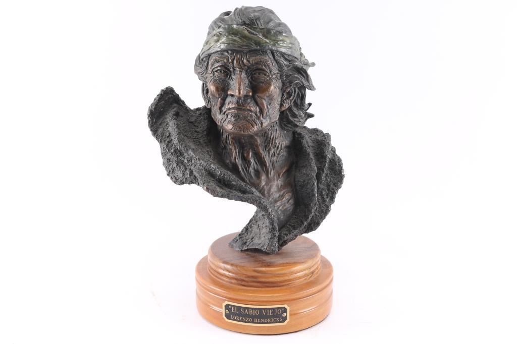 By Lorenzo Hendricks. Patinated and signed in cast and numbered 21/36. Measures 10" tall by 9" wide on a 3" base that is 6 1/2" diameter.