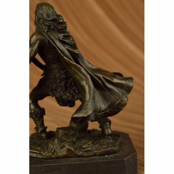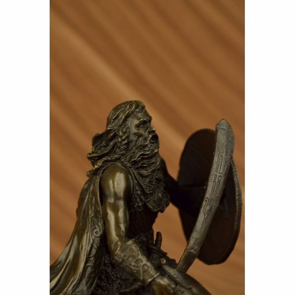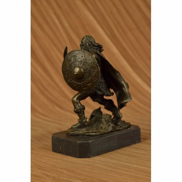 This European Warrior stand in a fighting pose ready to attack whomever comes close. He protects himself with his shield and his sword, as he stands on top some stoops he does not show any look of fear in fact he has a look of power and strength. Anyone will look at this amazing piece of art and stare in awe of how much details it has, from his weapons to his armor to the knee caps shields to the helmet that details are astonishing. 100% bronze and handmade, this brown patina sculpture was cast using the "Lost Wax Method" and mounted on a marble base. It is signed by the artist Kamiko. Condition: This sculpture is in perfect condition. Bronze Dimensions with Marble Base:Height 9" x Width 7" Marble Dimensions:7" X 4" Height without base: 8" Weight :10 LBS Inventory : 74Y7643847