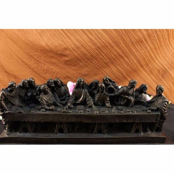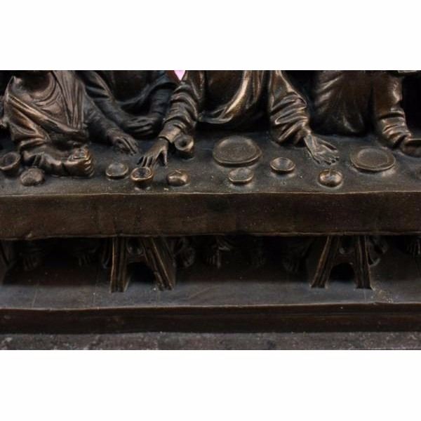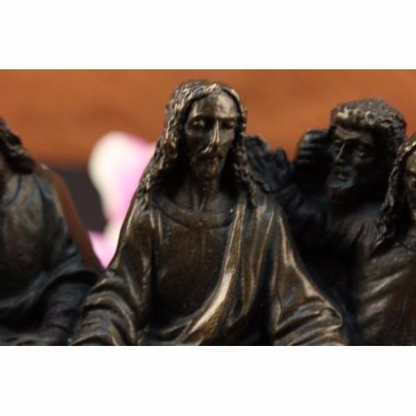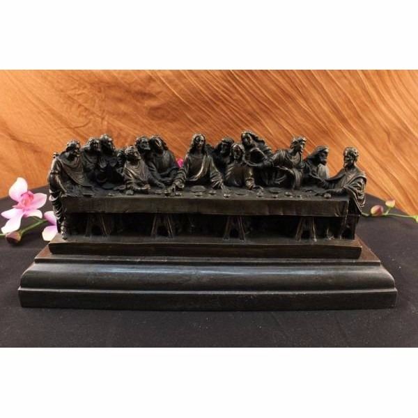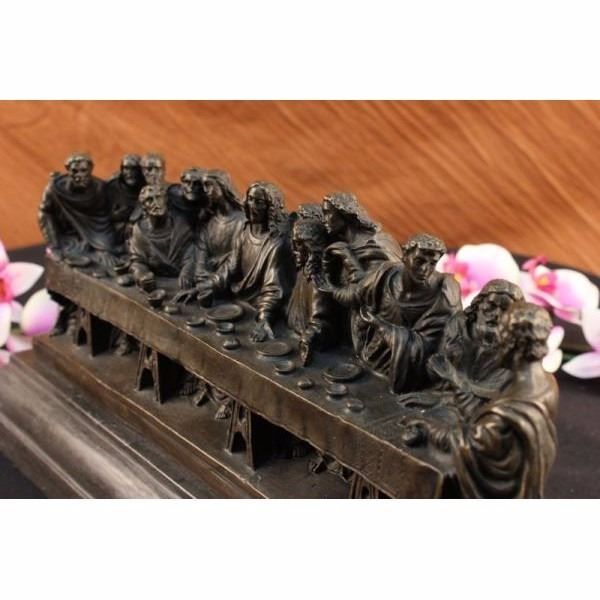 In the Christian faith, the Last Supper was the last meal Jesus shared with his apostles before his death. The Last Supper has been the subject of many paintings, of which perhaps the most famous by Leonardo da Vinci. This is ahandmade sculpture of that famous work, created by an unknown artist. Each figure is carved with an astonishing detail in stunning three-dimensionality, as if they are alive. This brown patina was cast using the "lost wax method." It is mounted on a black marble base and is stamped European Bronze Finery. Condition: This sculpture is in perfect condition. Bronze Dimensions with Marble Base:Height 7" x Width 14 1/2" Marble Dimensions: 14 1/2" X 5" Height without base: 6" Weight : 20 LBS Inventory 52Y4225025