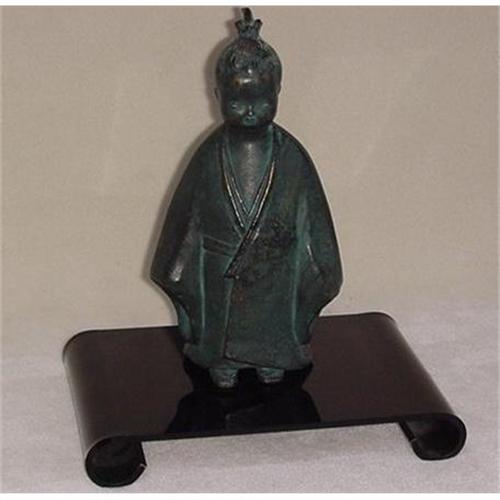 A contempory oriental figure,10 1/2" tall, bronze with green patina sits atop a black lucite stand. Condition is excellent.