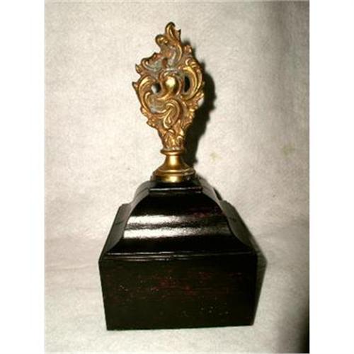 Large ornate bronze finial 19th century from France is mounted on a black wooden square dome capital with bits of deep red peeking out below. The four cross bar supports along with the hollow dome interior structure of 5/8 inch wood make it perfect for a header on a piece of furniture or architecturally used,a stair turn well,a paper weight or just a decorative accent piece. Excellent condition. Measures 11H X 5.5L X 5.5D.